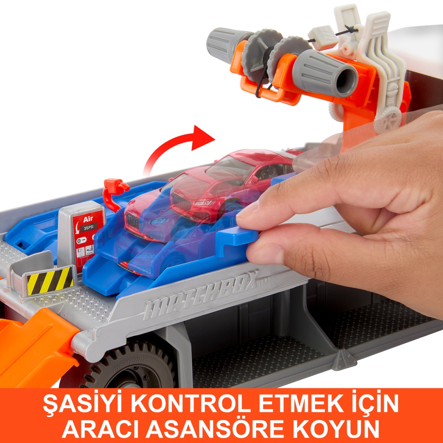 Çocukların, 1:64 ölçekli araçları servis için kamyona yükleyebilecekleri, hareket edebilen vinç içerir. Bir adet Matchbox metal Audi TT RS Coupe oyuncak araba dahildir. Diğer araçlar ayrı olarak satılır.