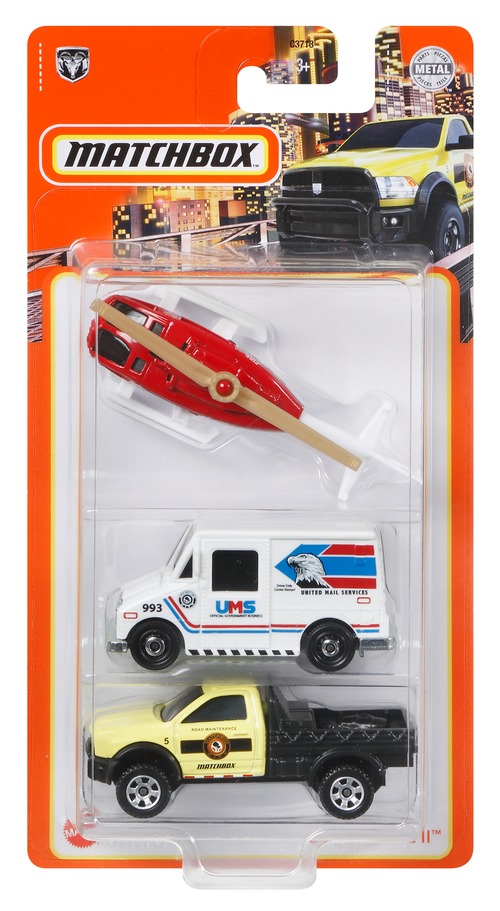 Şehir, kurtarma, inşaat ve macera temalı 3 Matchbox aracı bu sette!