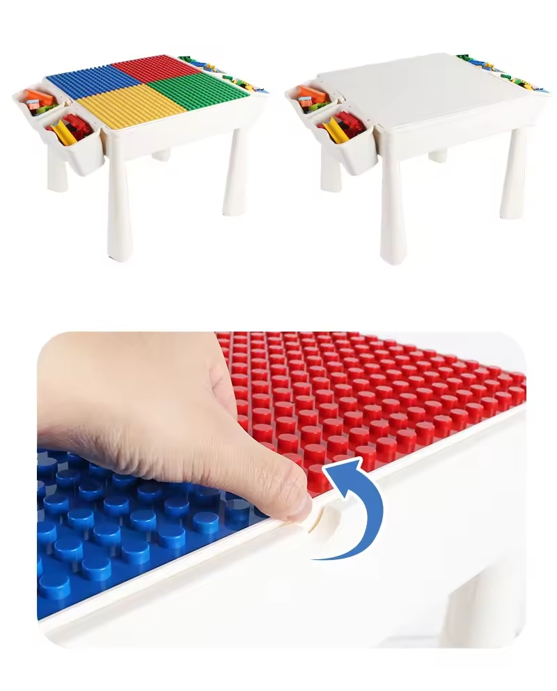Dönüştürülebilir masa, iki yüzeye sahip çıkarılabilir bir kapak sayesinde açılıyor: biri büyük plakalı, tüm çocuklar tarafından sevilen, Lego Duplo ile uyumlu, diğeri düz, çizim ve diğer oyunlar için uygundur.