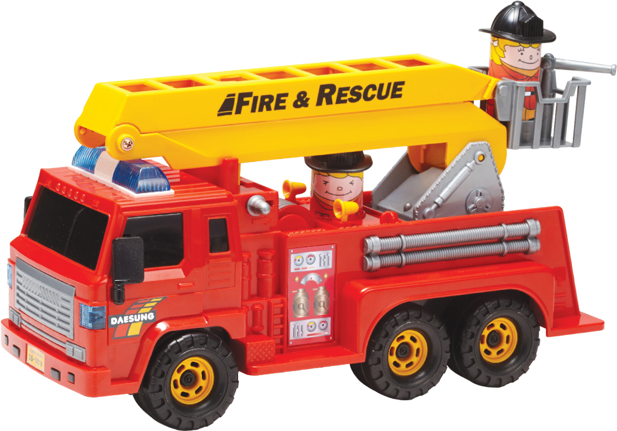 Tırmanma merdiveni, itfaiyeci için beşik, yangın hortumu vb. Arabada oturan başında siyah miğferli bir itfaiyeci işine ve görünüşüyle çocuğunuza yangın söndürme oyununda kahramanca bir işe ilham vermeye hazırdır.