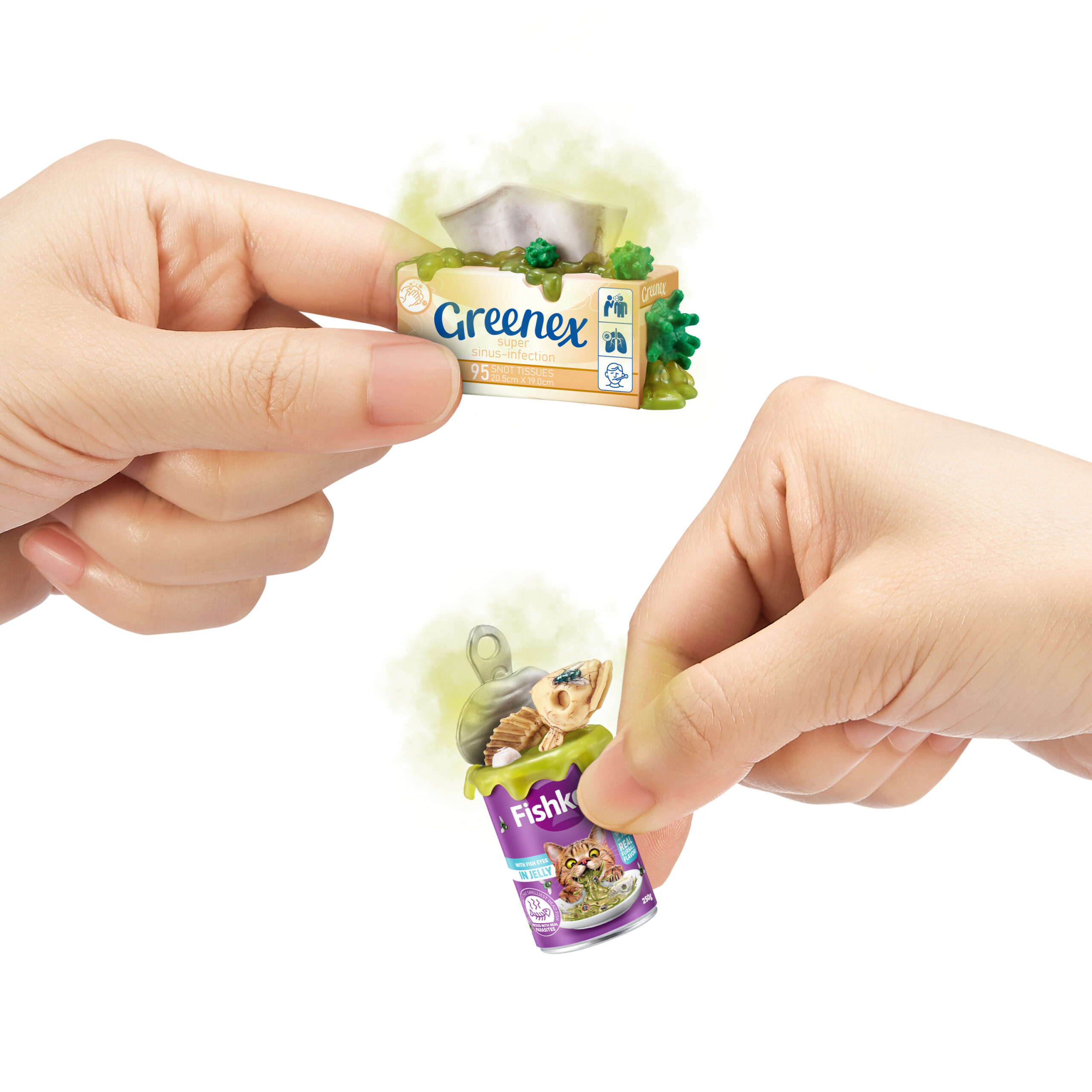 koleksiyondaki kapsüllerin her biri, 3 Mega Gross mini figür, bir çöp torbası,