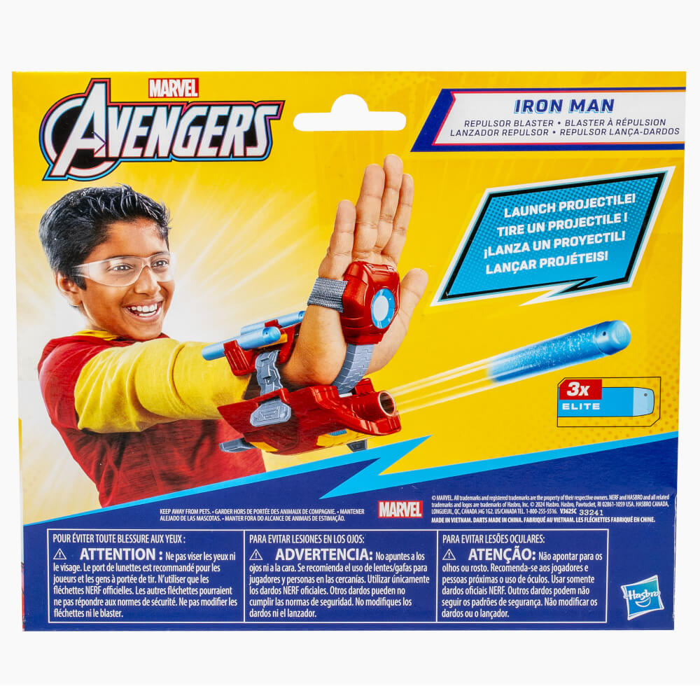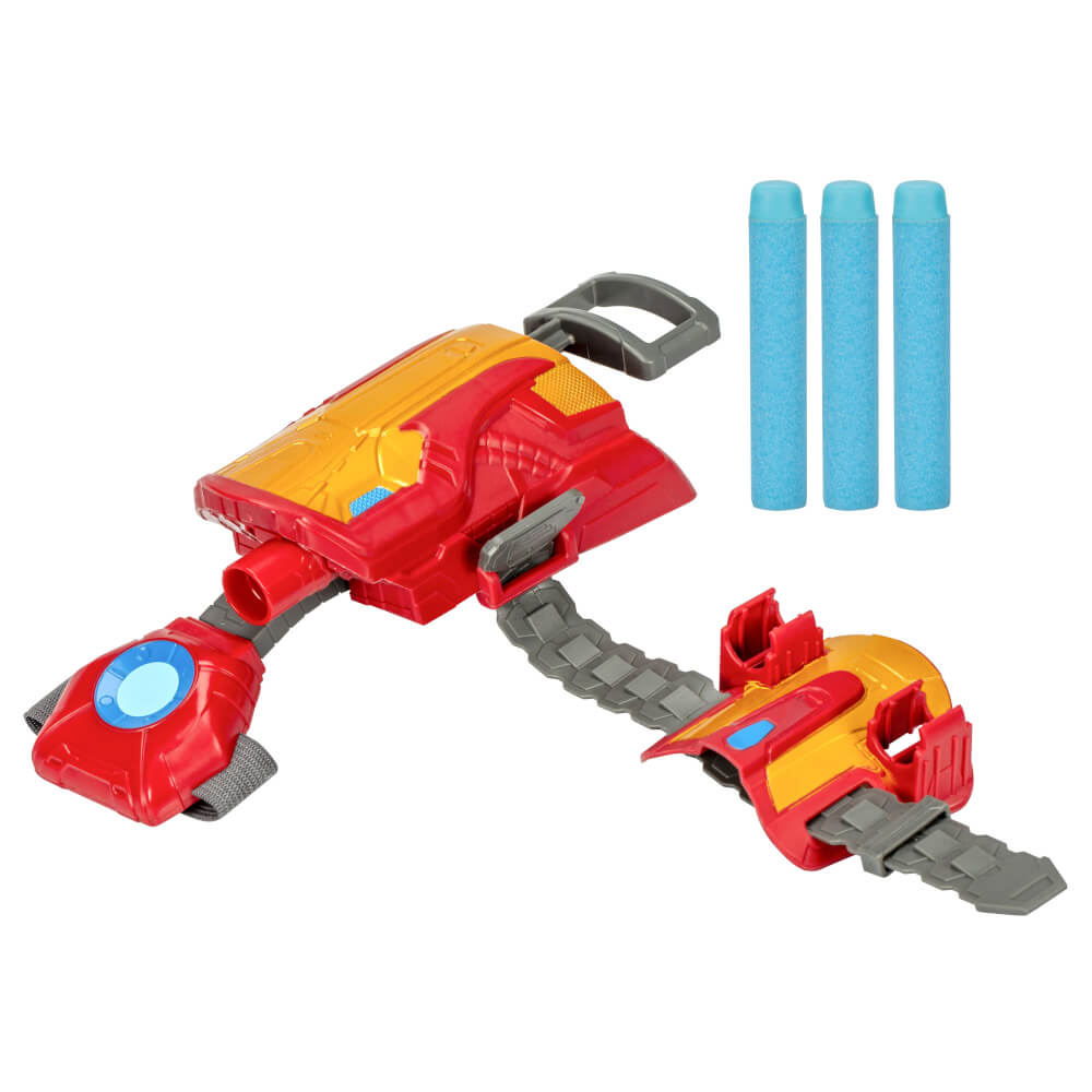 Avengers Iron Man Dart Fırlatıcı, 3 NERF dart içerir, böylece çocuklar bir dartı eldivene yerleştirdiklerinde, onu fırlatabilir ve Iron Man'ın düşmanlarına ateş edebilirmiş gibi yapabilirler