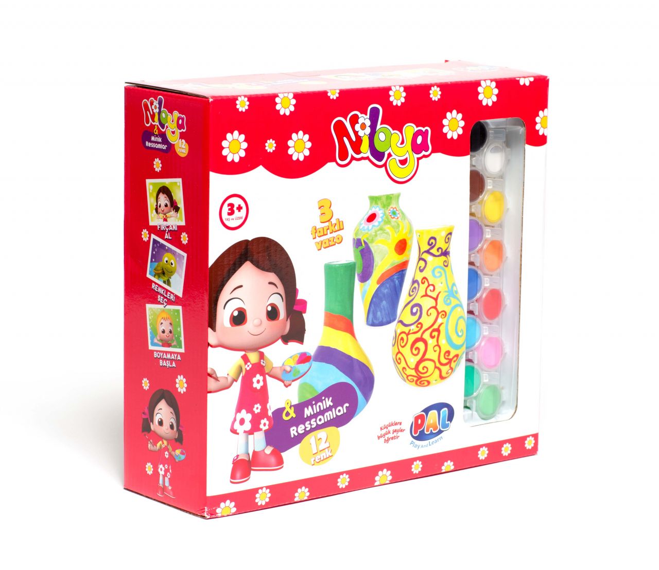 Niloya Minik Ressamlar ile çocuklarınız boya yapmayı, boya ile sanatı çok yakından öğrenecekler. Oyuncağımız da 3 adet vazo, 12 farklı renkte boya ve 1 adet fırça bulunmaktadır. Çocuklar Niloya ile sevinecek, sevindikcede öğrenecekler.