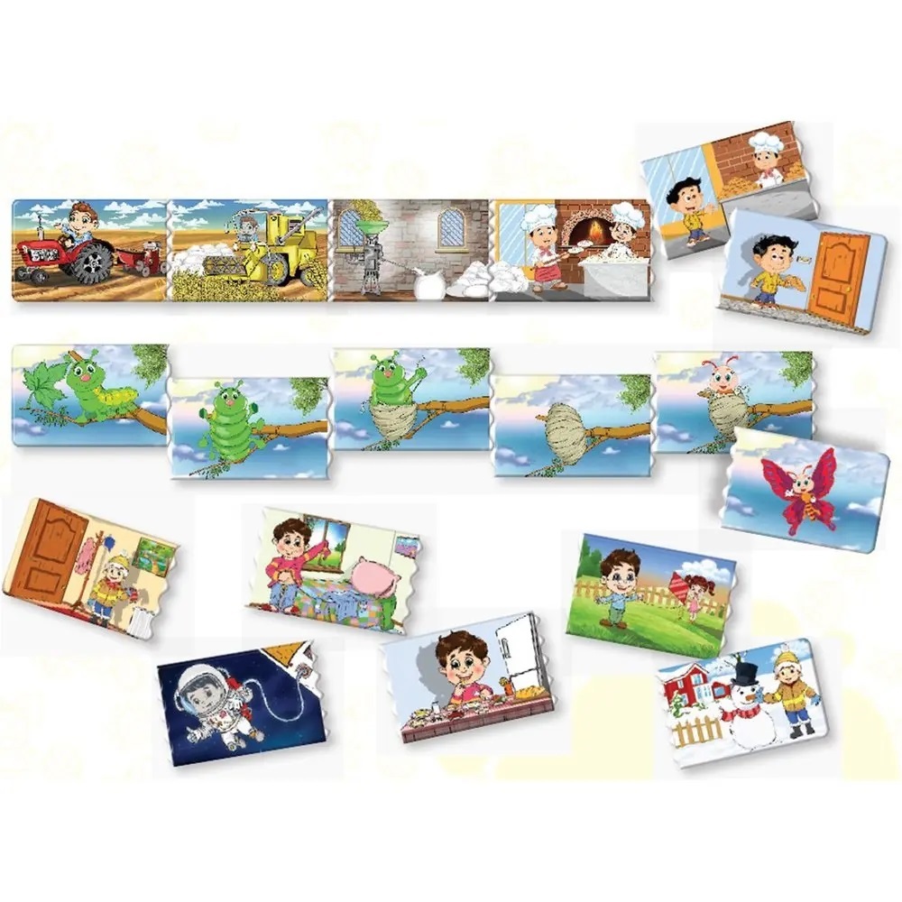 Oyun sırasına göre çocukların ellerindeki büyük kartın sağ ve sol tarafında üçer küçük kart tamamlanıncaya kadar oyun devam eder.