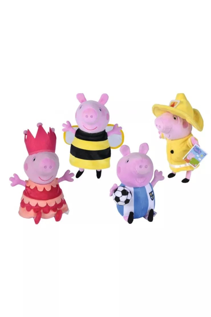 Her biri farklı tema ve kıyafetlere sahip Peppa Pig karakterleri, yumuşak dokusu ve canlı renkleriyle dikkat çeker.