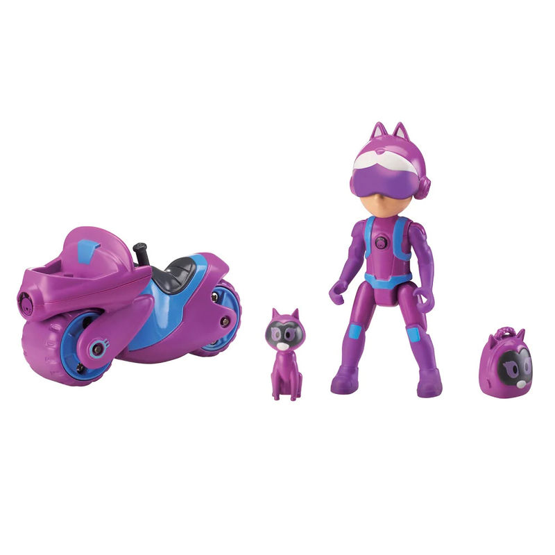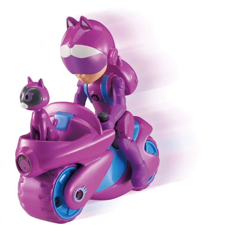 Her karakterin bir motosikleti ve bir robot figürü vardır.