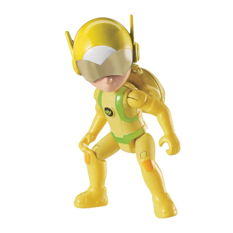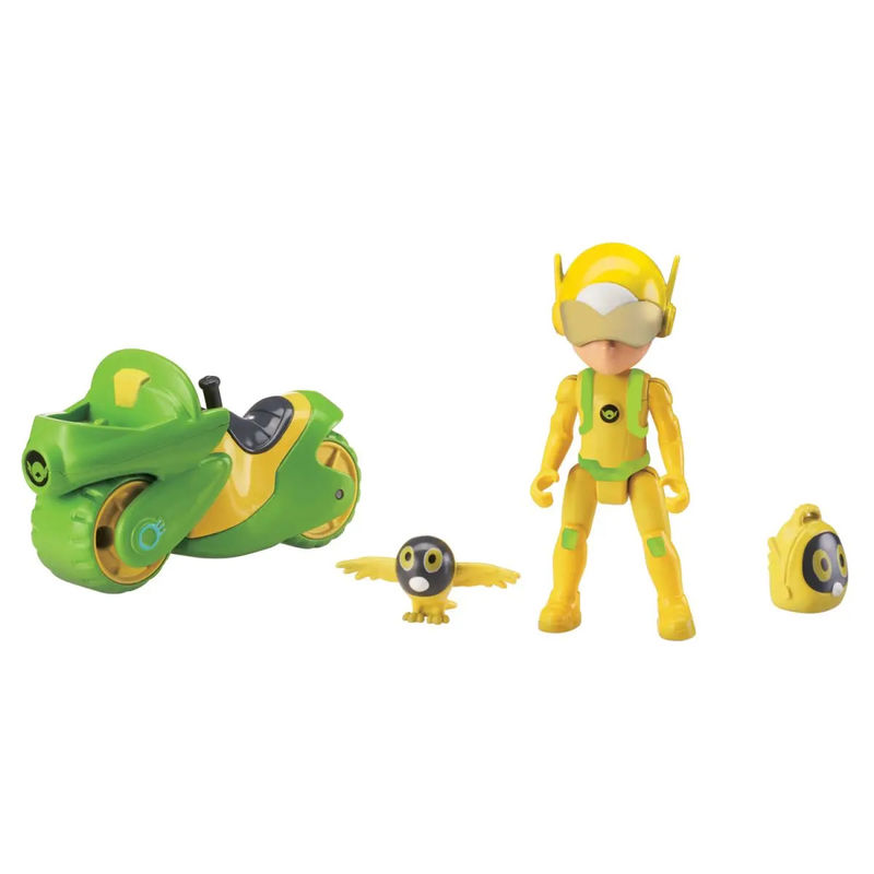 Her karakterin bir motosikleti ve bir robot figürü vardır.
