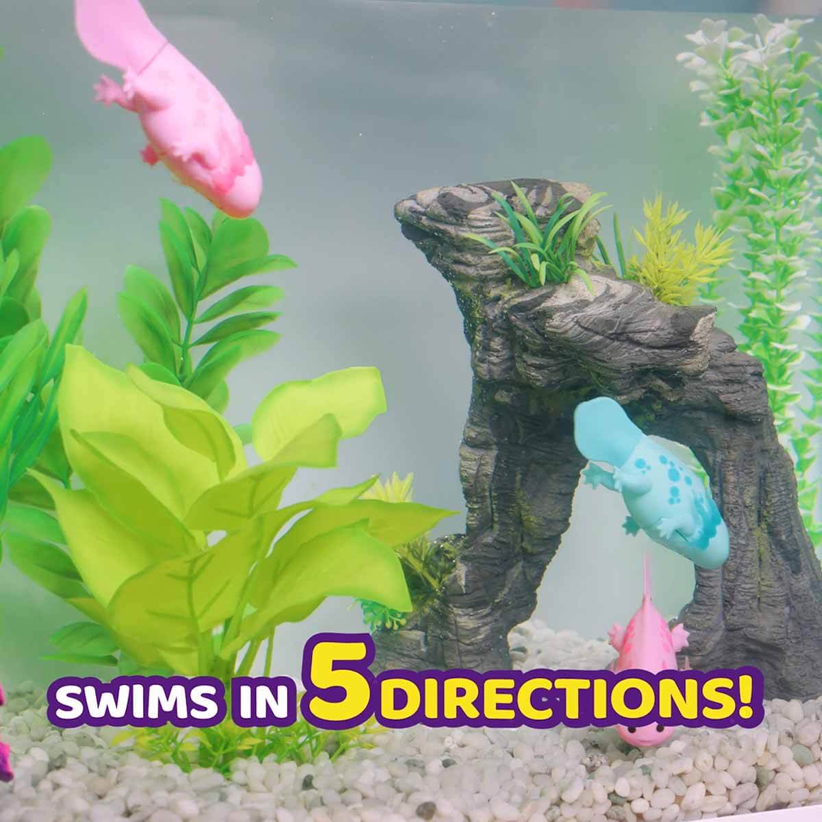 Suya bırakıldığında hareketleniyor ve dikkat çekici renkleri ile suda yüzerken herkesi kendine hayran bırakıyor. Sevimli axolotl çok meraklı ve etrafı keşfedeceği için çok heyecanlı! 5 farklı yönde yüzerek gezilmedik yer bırakmıyor. Gerçek bir axolotl’dan ilham alan detay tasarıma sahip oyuncak, 4 dakikalık kullanım sonrası otomatik olarak uyku moduna geçiyor ve böylece pil tasarrufu sağlıyor. Eğlence bitti sandığın zaman tekrar başlıyor. Üstelik birden fazla axolotl ile sevimli hayvanların birlikte yüzmesini sağlayabilirsin. Su hazır mı? O zaman kuyruklarını sallayarak ilerleyen axolotl’ları su ile buluşturma zamanı!