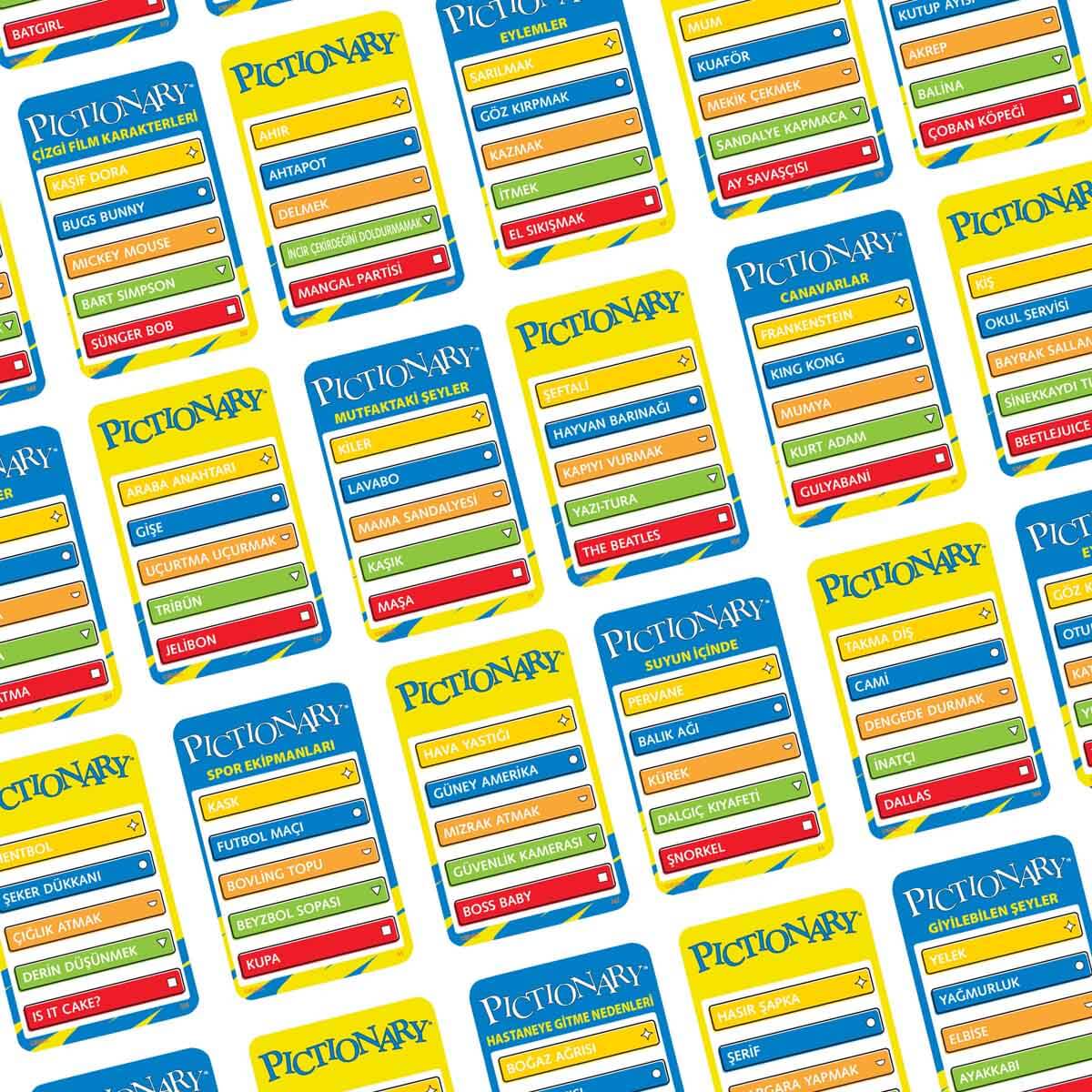 Üç zorluk düzeyi arasında, minik oyunculara adım adım çizim yapmayı gösteren 'Acemi Çizer' kartları da bulunur. Bir oyuncu çizim yapar, takımındaki diğer oyuncular da kelimeyi tahmin etmeye çalışır. 'Herkes Oynar' turlarında, iki takım aynı anda oynar! Çizim becerisi gerektirmez, kelimeleri tahmin etseniz de edemeseniz de çok eğleneceksiniz! Pictionary, ailenizle veya dostlarınızla düzenleyeceğiniz oyun gecelerine eğlence katmak için geliyor!