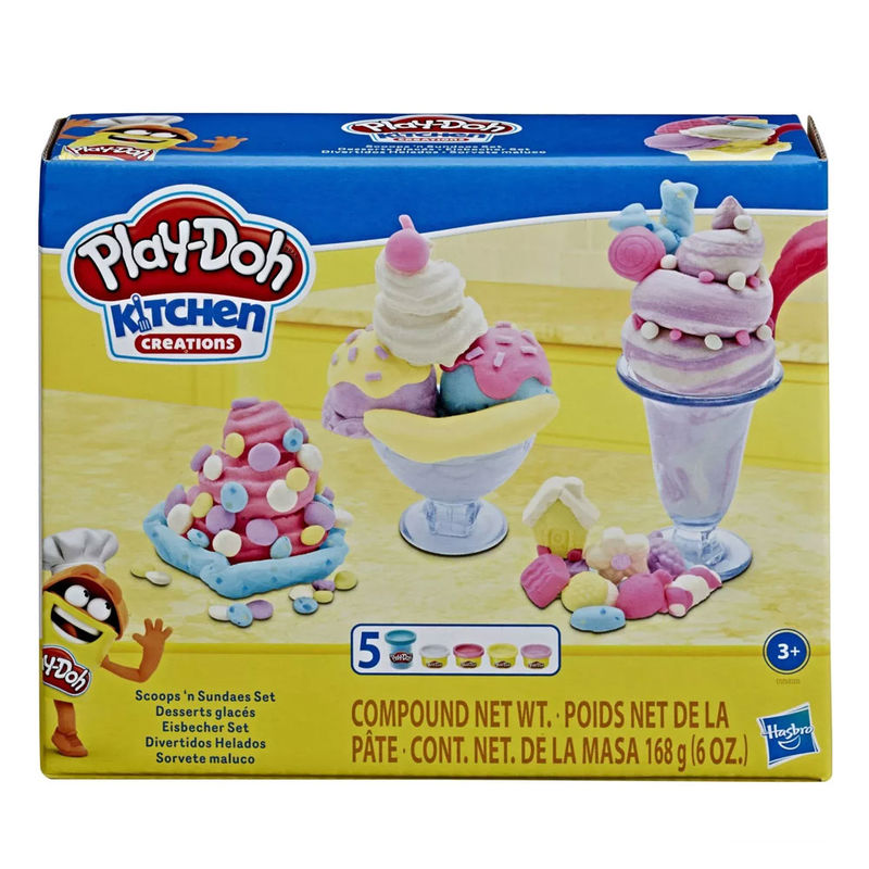 İçindekiler: 3 takılabilir raylı ekstruder aleti, silindir, bıçak aleti, şeker kalıbı, kepçe, 3 kova ve 5 kutu Play-Doh Oyun Hamuru (227 g) içerir.