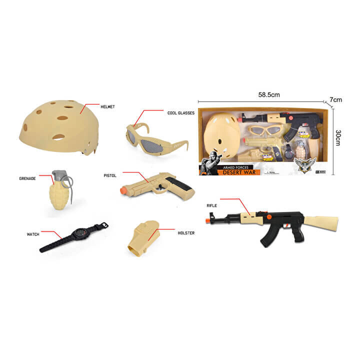 İçerisinde bir tüfek, bir el bombası, bir gözlük, bir kask, bir tabanca, bir tabanca kılıfı ve bir oyuncak saat bulunmaktadır.