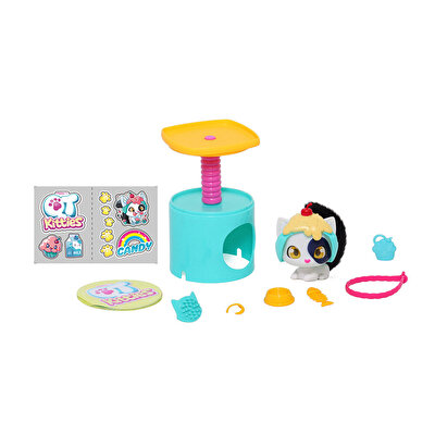 Set içerisinde: 1 adet kedicik, kedi evi, 6 aksesuar, çıkartma kağıdı ve koleksiyon kağıdı içerir.