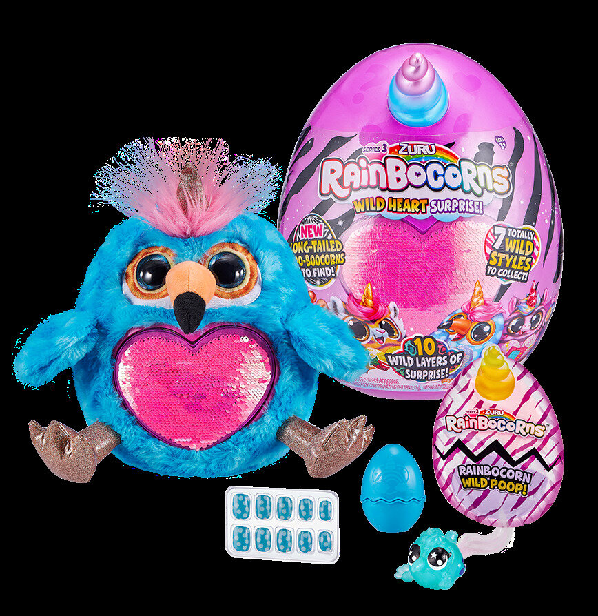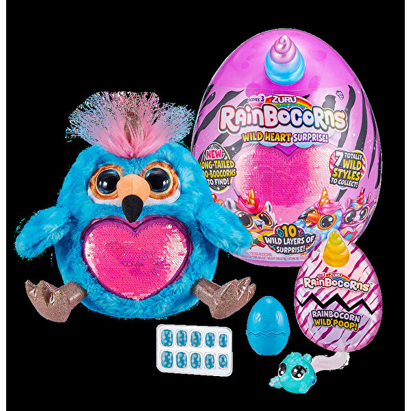 Üzerinde kalp şeklinde pullar, içinde yumuşacık bir pelüş Rainbocorn var!