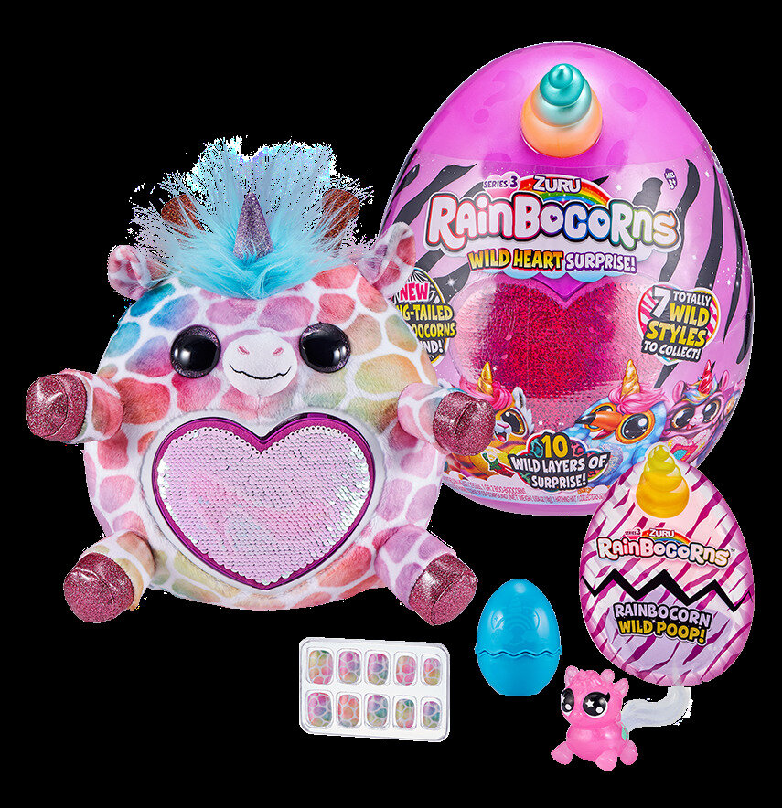 Üzerinde kalp şeklinde pullar, içinde yumuşacık bir pelüş Rainbocorn var!