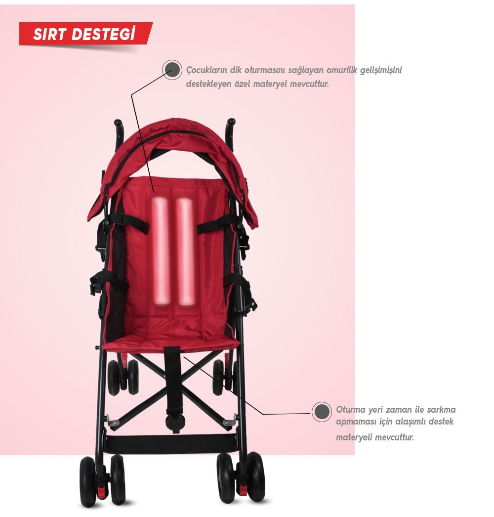Sırt dayanağındaki kumaş içerisinde, çocukların dik oturmasını destekleyen özel materyal mevcuttur.