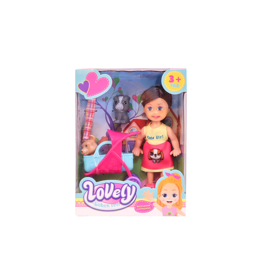 Kutu; 2 adet minik köpek, bir köpek arabası ve bir adet minik bebek içerir.