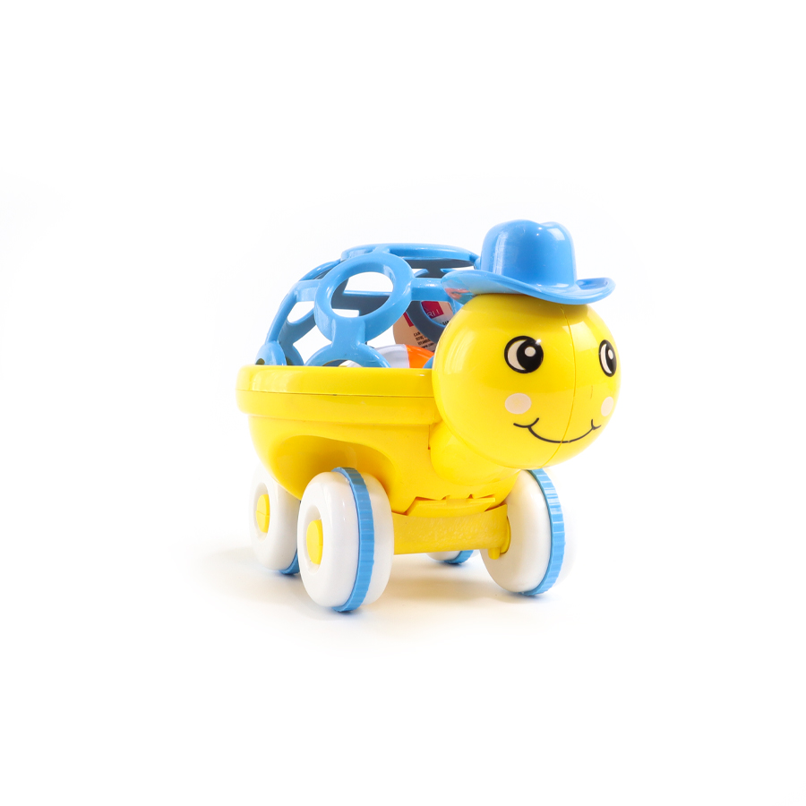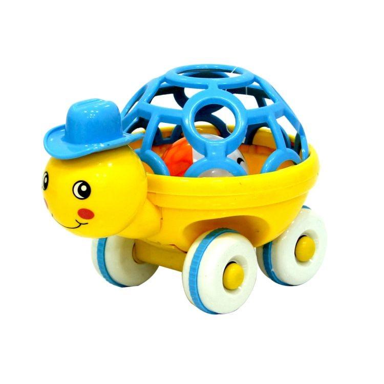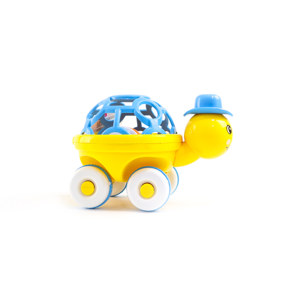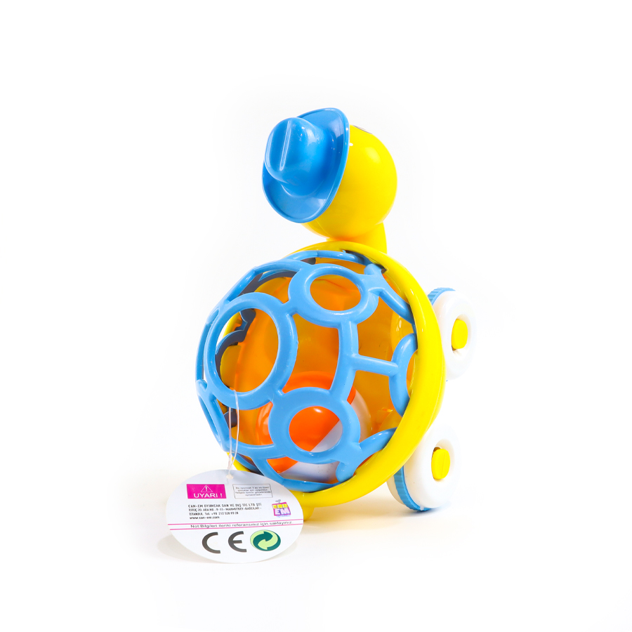 Kaplumbağa figürlü çıngırak, içindeki topun çarpması ile ses çıkarır.