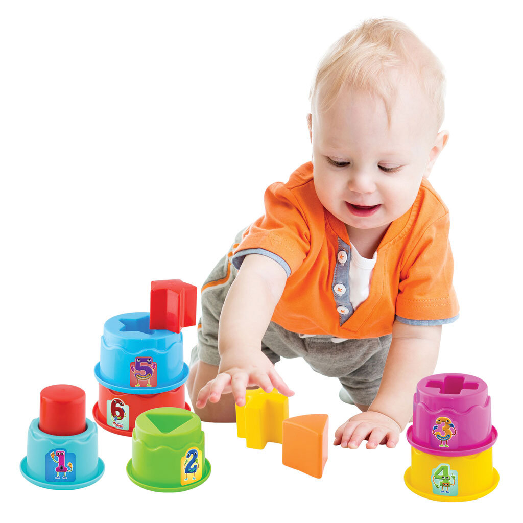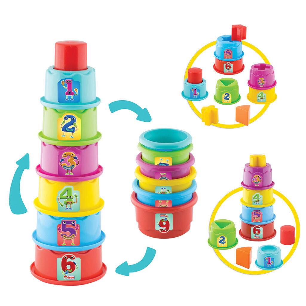 6 farklı boyda kap ve her kabın içine yerleştirilecek 6 farklı renkte şekil vardır.