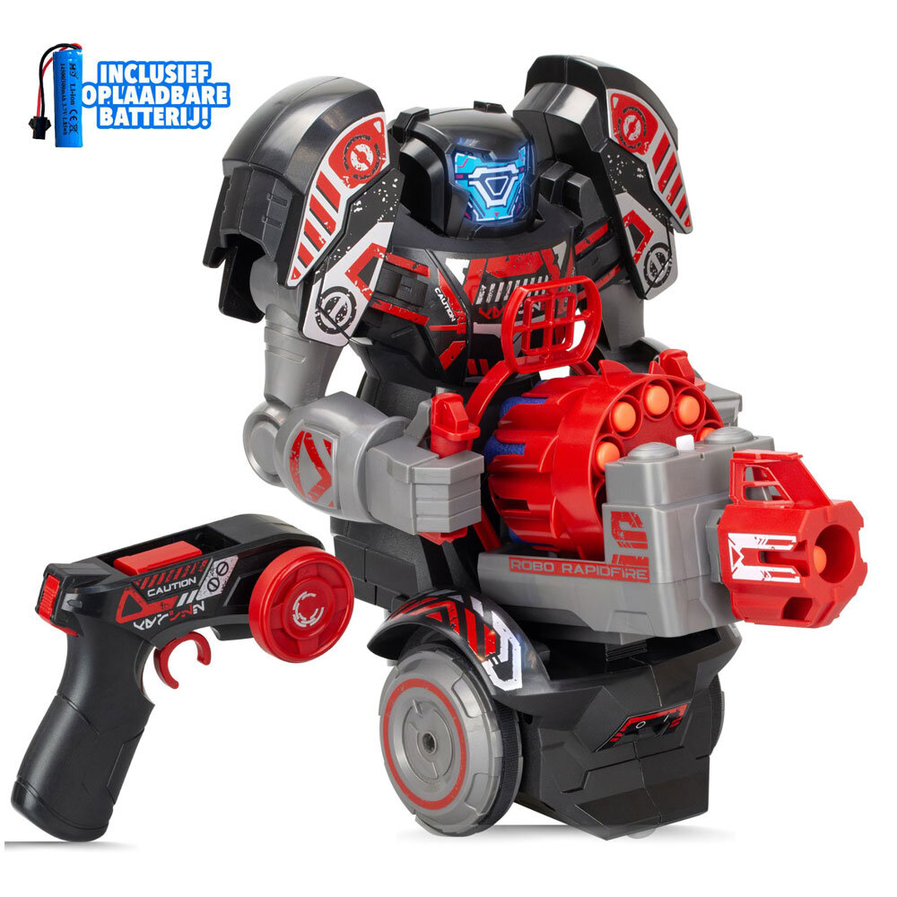 Ancak heyecan burada bitmiyor! ROBO RAPIDFIRE'ımız agresif bir LED yüze ve dinamik ses efektlerine sahiptir ve oyun deneyimini yoğunlaştırır.