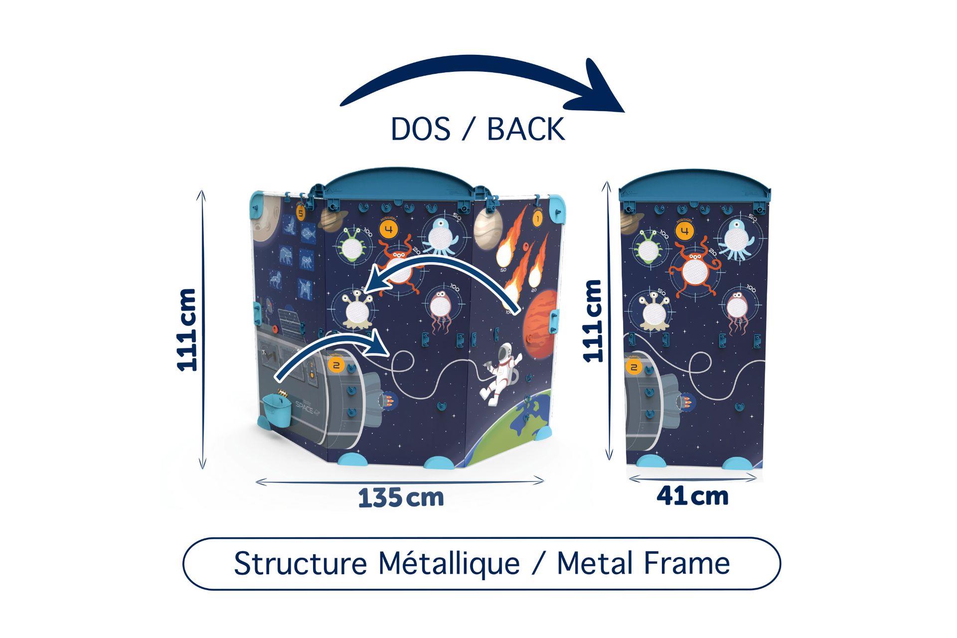 Smoby Uzay Merkezi, yüksekten monte edilmiş üç kanattan oluşur. kaliteli karton parçalar ve sağlam bir metal çerçeve ile çevrelenmiştir.