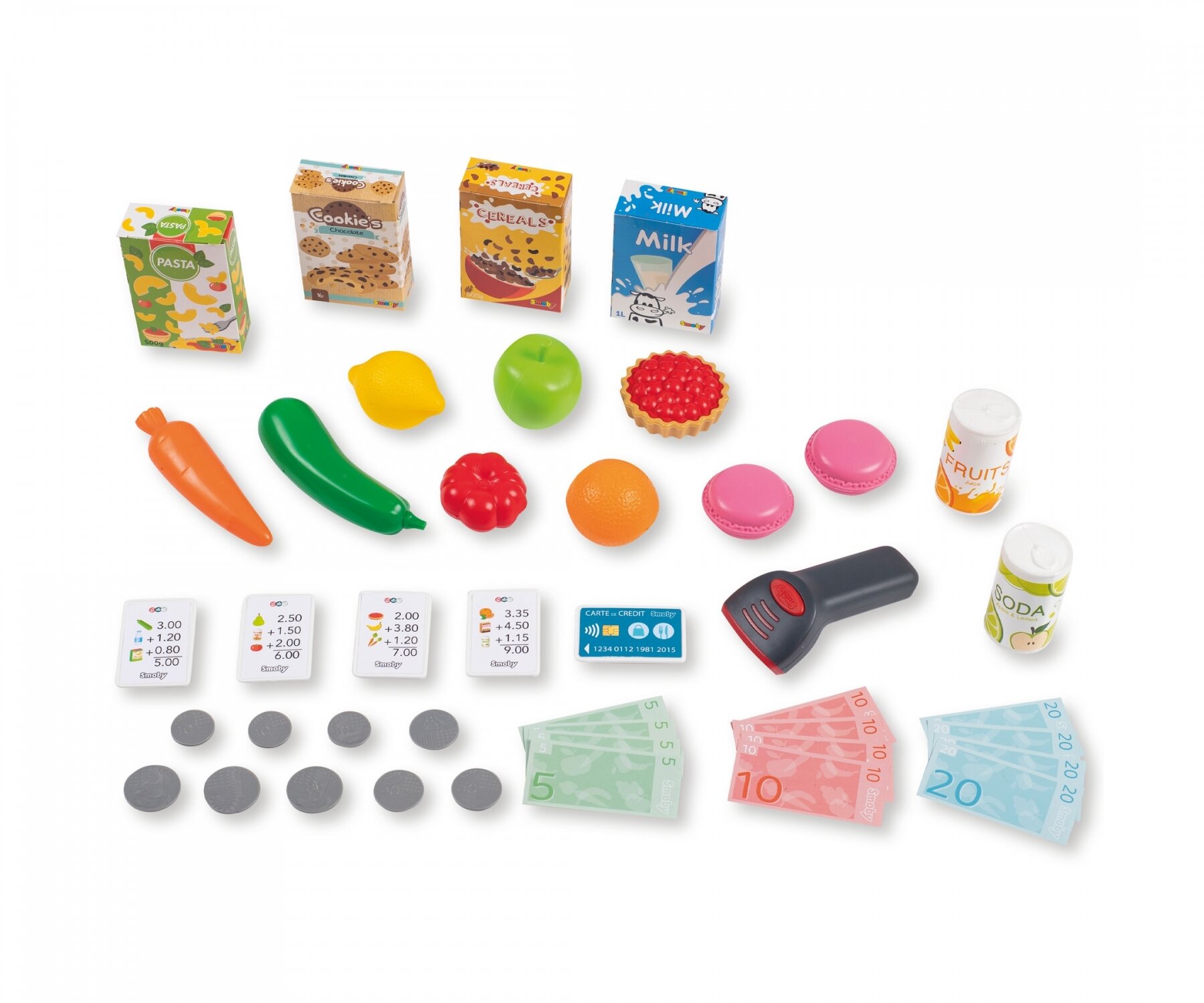 Bu şekilde çocuklar parayı doğru şekilde kullanma yolunu öğrenirler. Elinizde nakit yoksa sorun değil, kredi kartı okuyucuya takılabilir. Meyve ve sebzeler mekanik terazide tartılabilir ve geniş süpermarket yelpazesinde ayrıca tatlılar ve çok sayıda oyun gıda ambalajı bulunur. Tüm ürünler raflarda düzgün bir şekilde sunulabilir.