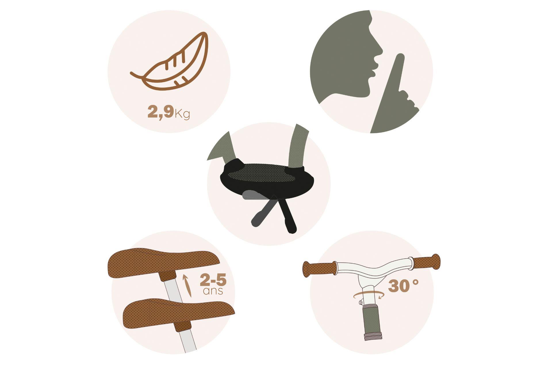 Yüksekliği ayarlanabilen ve konforlu koltuk, denge bisikletinin çocuğun boyuna göre kişisel olarak uyarlanabilmesini sağlar ve çocukların dengelerini bulmalarını kolaylaştırır.