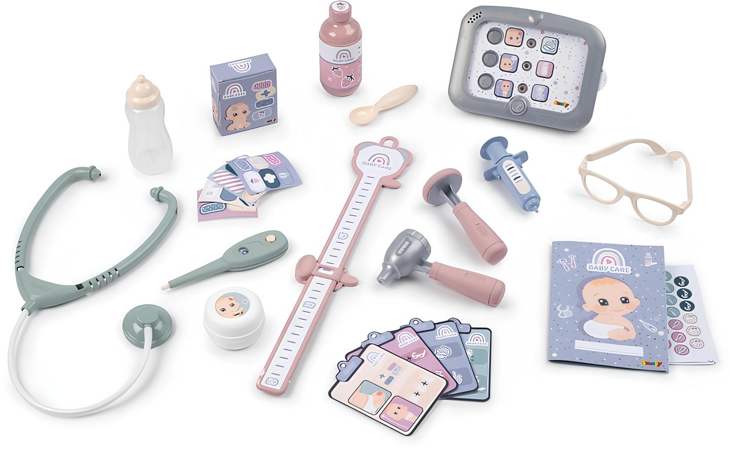 muayene masası, stetoskop, termometre, otoskop, oyuncak bebeğinin motor