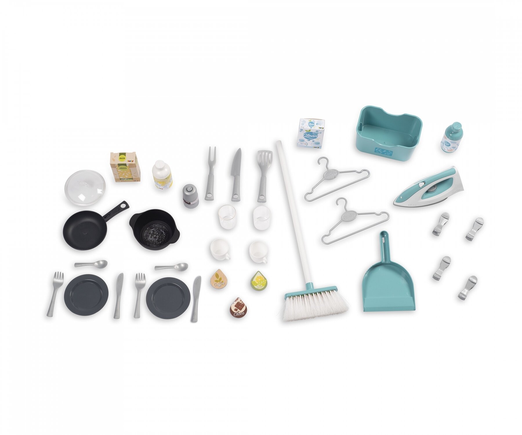 adet çatal, 2 adet kaşık, 3 adet kahve kapsülü, tuzluk ve biberlik, süpürge,