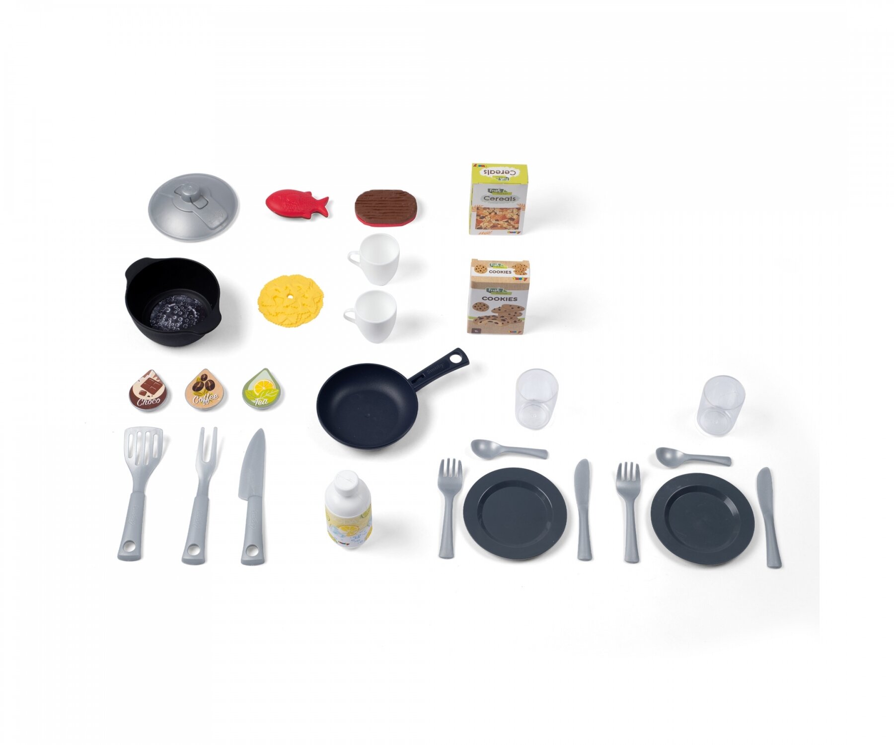 Sihirli aksesuarlar da harika: et ve balığın iki farklı tarafı var - çiğ ve kızarmış ve sihirli makarna da hazır. Ocak üstündeki elektronik bir ses modülü gerçekçi pişirme sesleri sağlıyor.