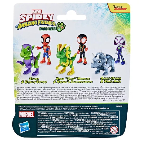 Her aksiyon figürü seti, güncellenmiş Dino-Webs kostüm tasarımına sahip 10 cm'lik hareketli bir Takım Örümcek Adam karakteri ve okul öncesi çocukların muhteşem maceraları hayal etmelerine ilham verecek hareketli bir Dino-Kötü Adam içerir.