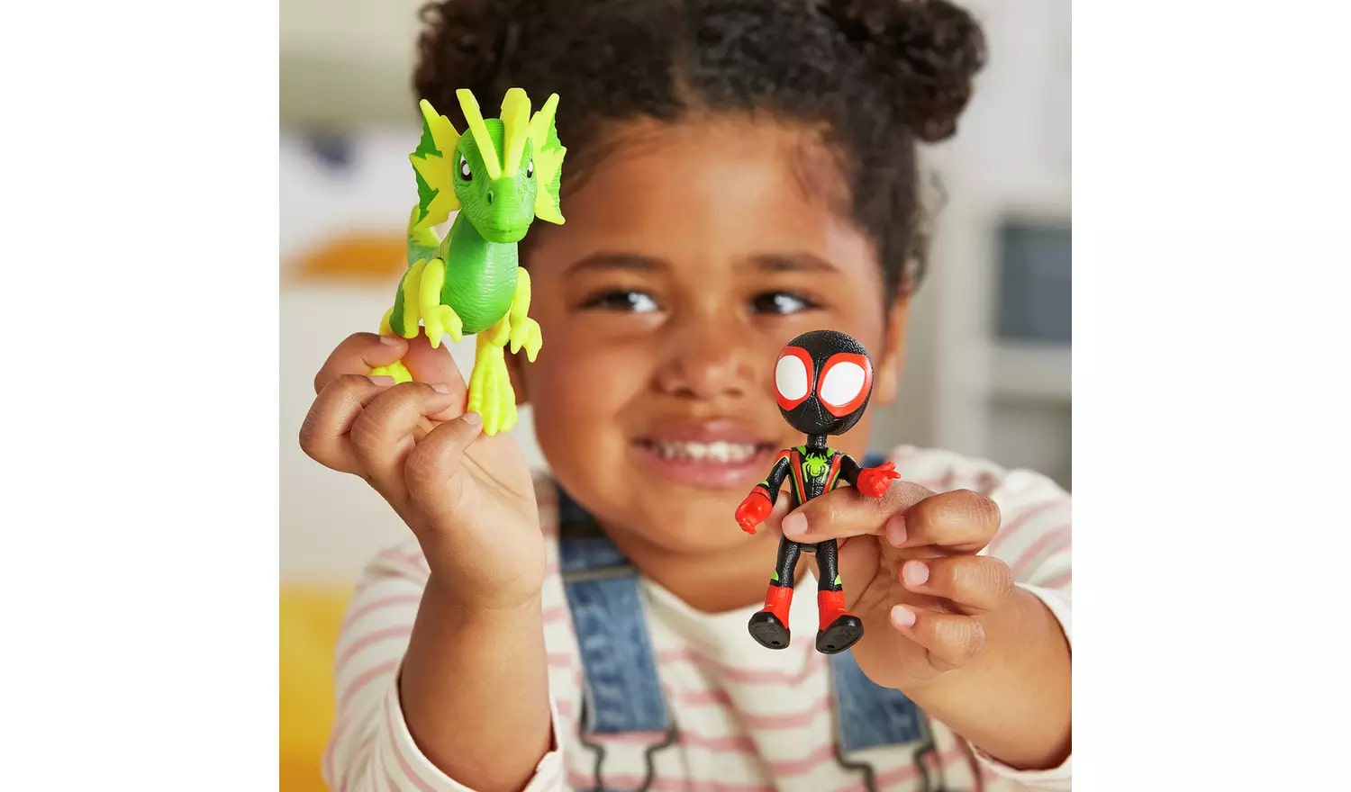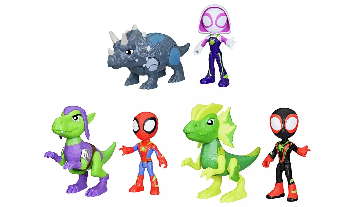 Her aksiyon figürü seti, güncellenmiş Dino-Webs kostüm tasarımına sahip 10 cm'lik hareketli bir Takım Örümcek Adam karakteri ve okul öncesi çocukların muhteşem maceraları hayal etmelerine ilham verecek hareketli bir Dino-Kötü Adam içerir.