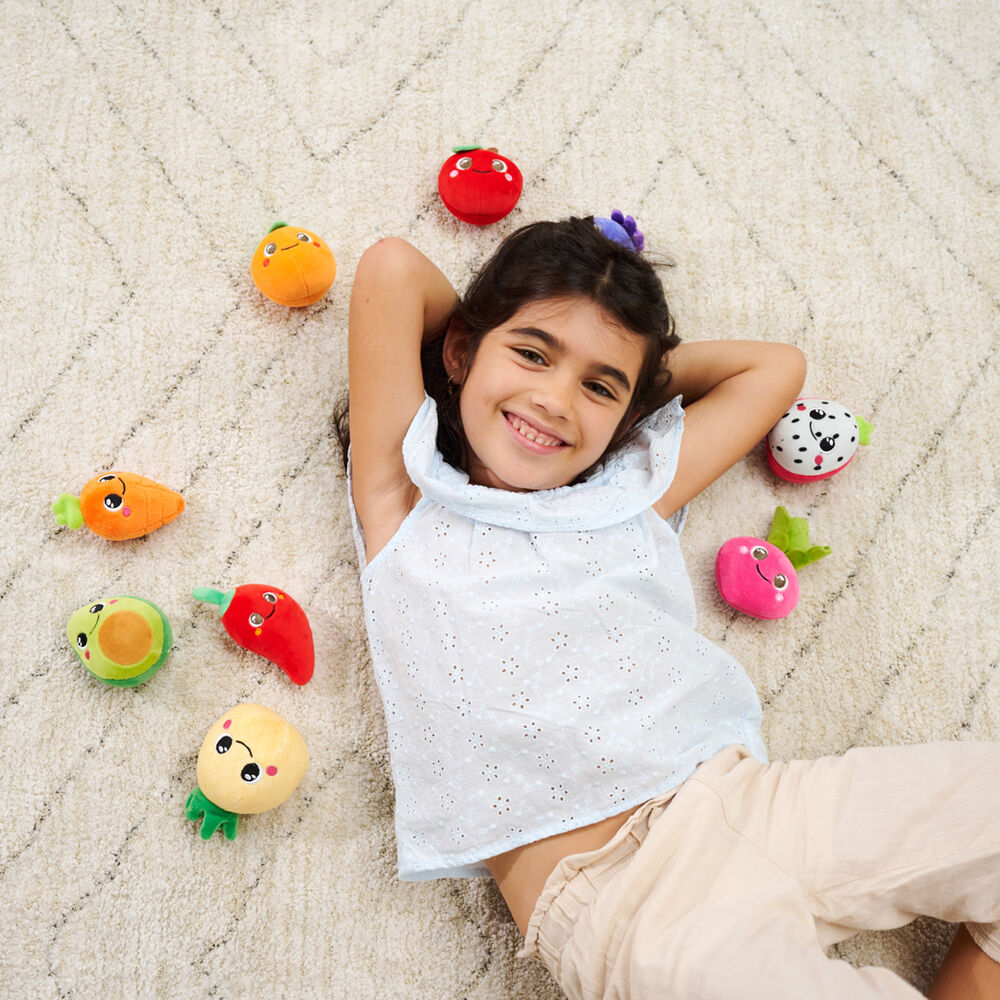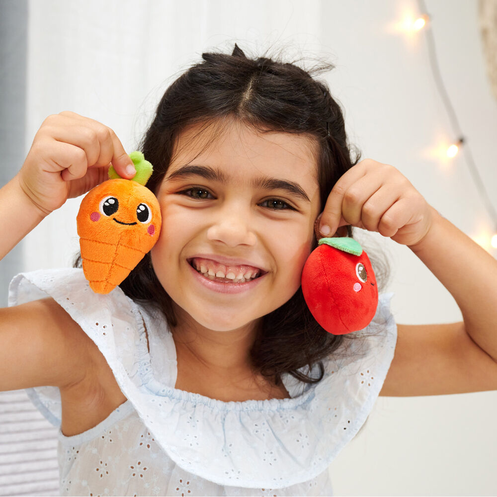 Meyve ve sebze şeklindeki peluş figürler arasında limon, avokado, çilek ve hatta ananas bile var. Sevimli yüzlere sahip bu yumuşak dostlar yaklaşık 8 cm boyundadır ve koleksiyon için idealdir.