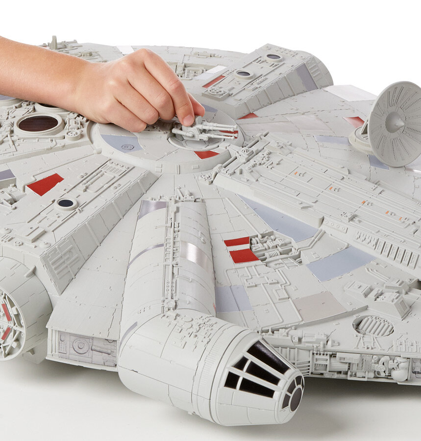 Millennium Falcon açılınca 9,5 cm boyutundaki Star Wars figürleri için dev bir oyun setine dönüşüyor. Gemideki açılır füze fırlatıcı ile Nerf Elite dartları atılabiliyor. İnce detayları ve aksiyon dolu bölümleriyle göz dolduran Millennium Falcon, turbolazer kule, ışıklı LED topları, harekete duyarlı ses efektleri ve ışık hızı ses efektleri ile macerayı bire bir yansıtıyor. Kutuya BB-8, Chewbacca ve Finn’in 9,5 cm boyundaki özel figürleri de dahil.