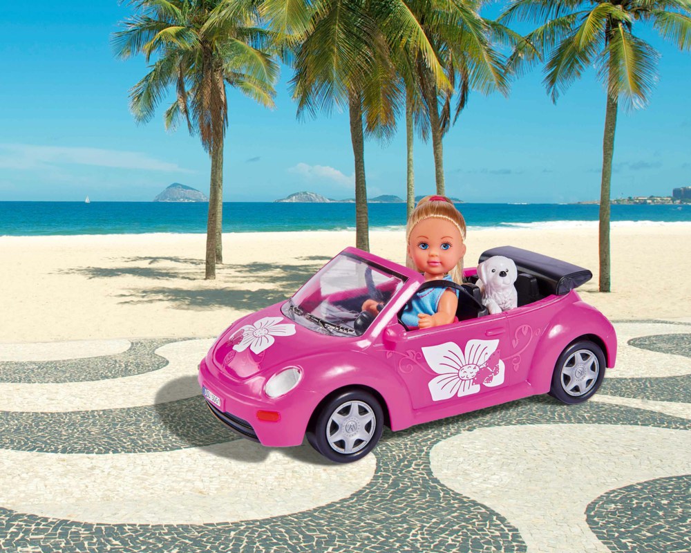 Dahil edilen 12 cm'lik Evi bebeği sevimli bir kıyafet giyiyor ve sürücü tarafındaki Beetle arabasının içine kolayca sığabiliyor.