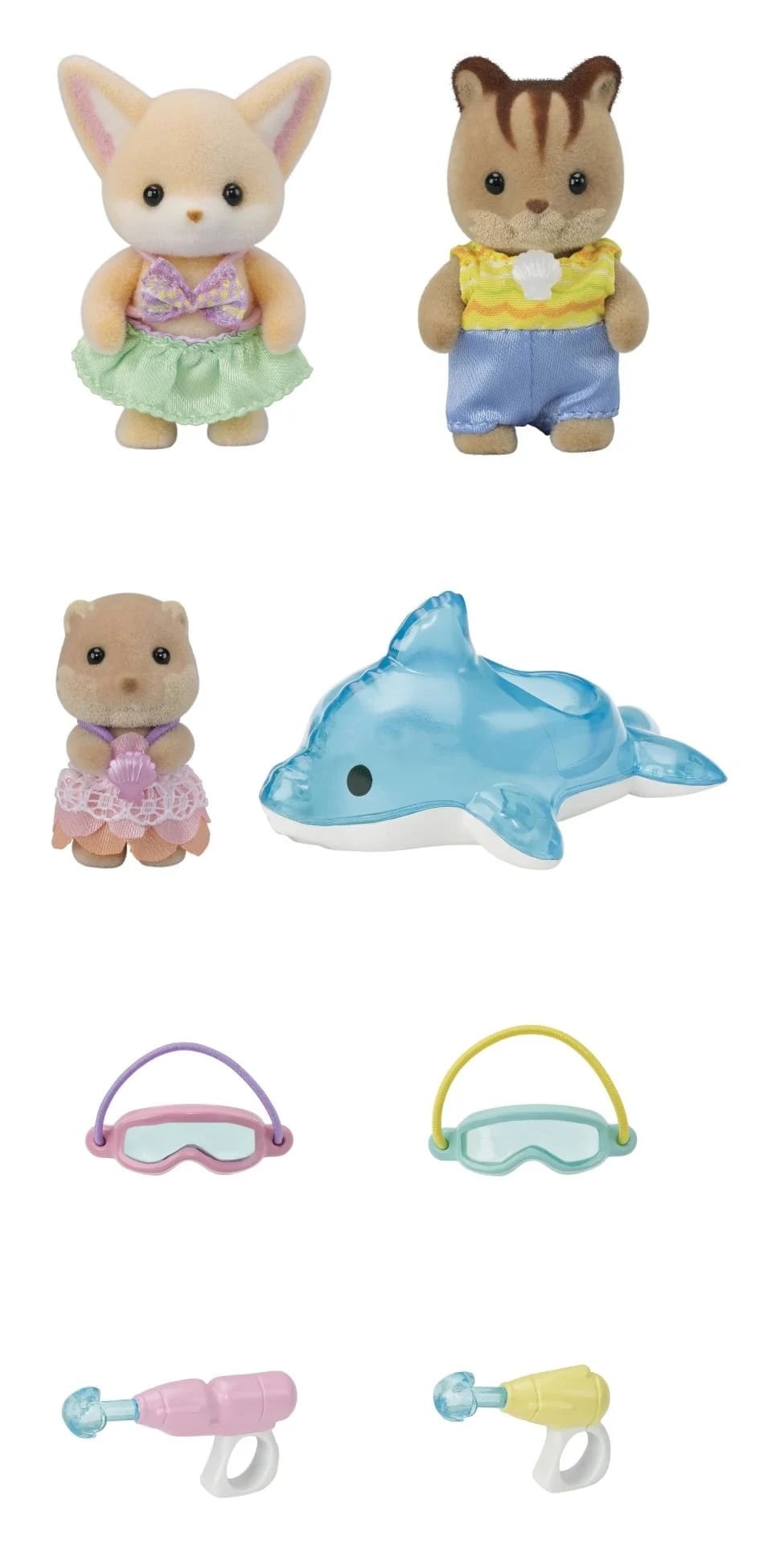 Havuz gözlükleri, şişme yunus oyuncağı gibi çeşitli aksesuarlarıyla gelir.