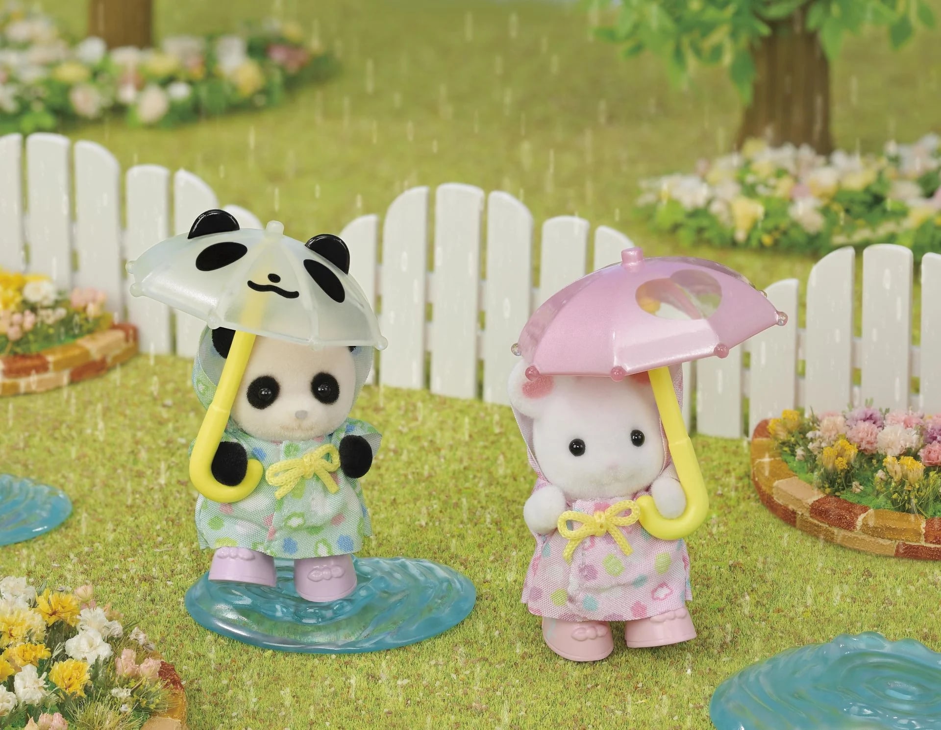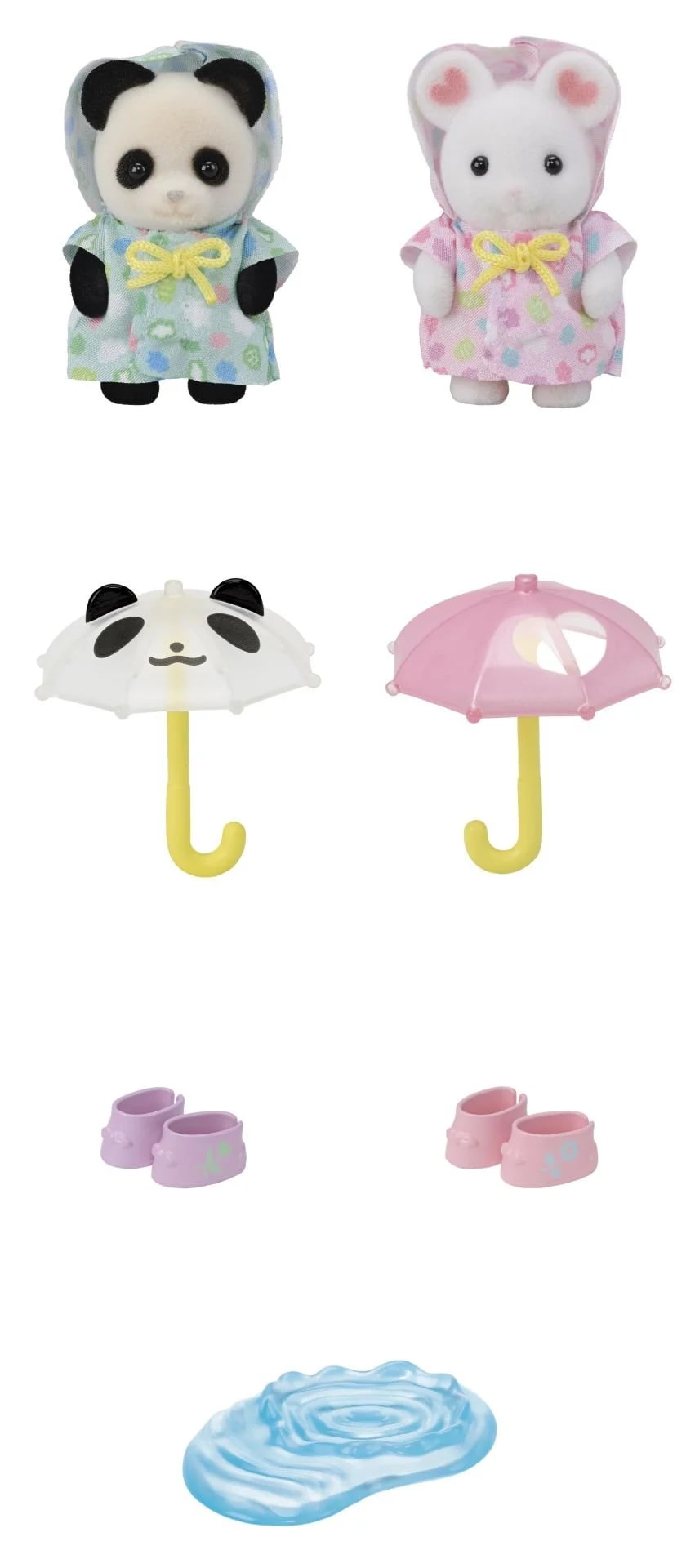 Pandalı ve kalpli şemsiyeleri, yağmur botları ve su birikintisi aksesuarlarıyla gelir.