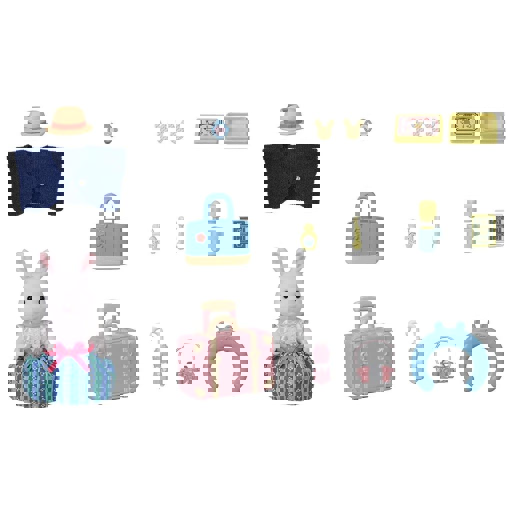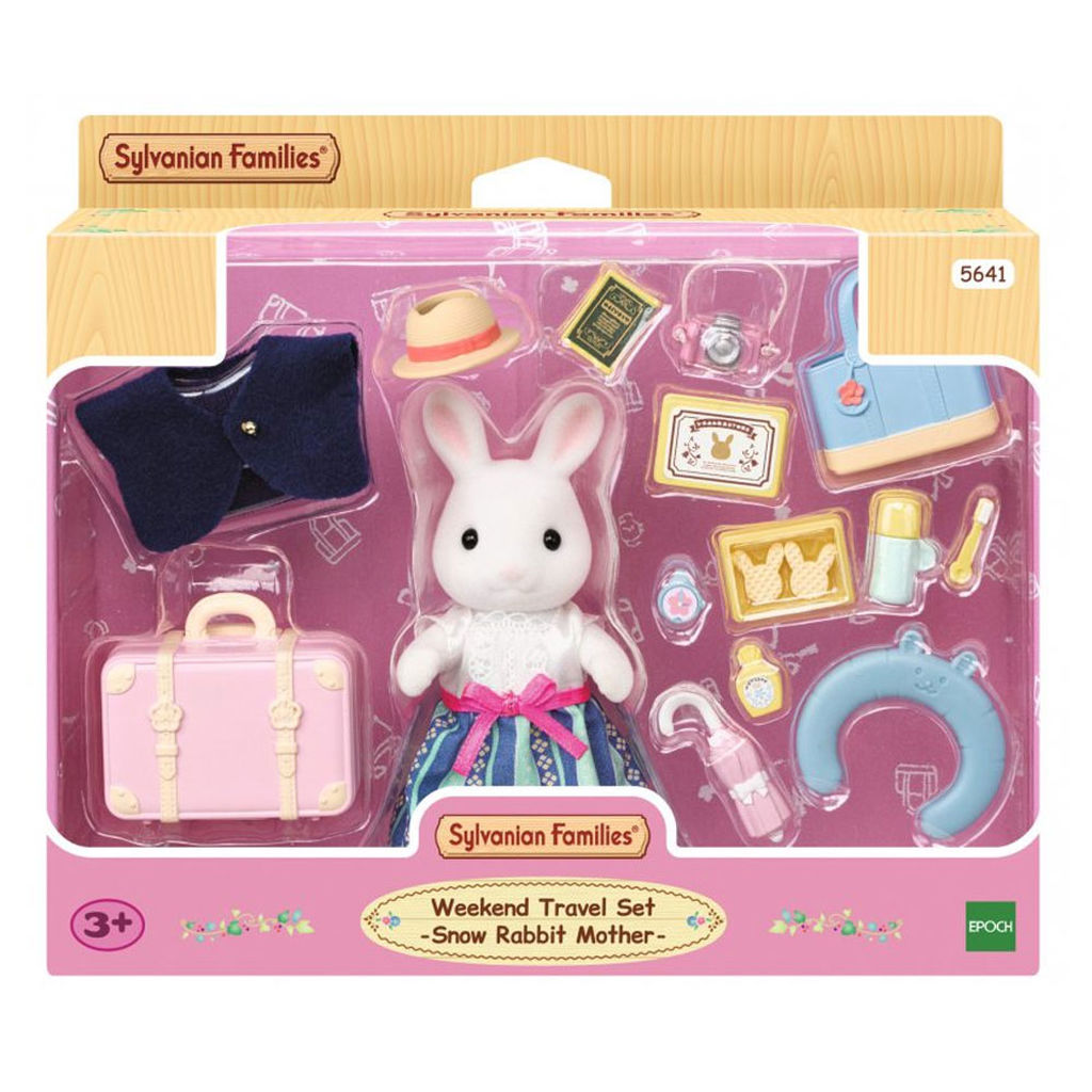 Sylvanian Families Hafta Sonu Seyahat Seti, bir bavul, bir çanta, bir saat, bir beslenme çantası, kurabiyeler, bir diş fırçası, bir içecek şişesi, bir kitap, bir şemsiye, bir kamera, bir boyun yastığı, bir şapka, bir yelek ve bir kar tavşanı Anne figürü dahildir.
