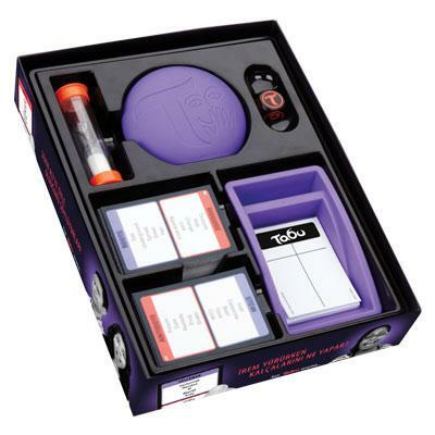 Kutuya 260 kart, Tabu düdüğü, kum saati, puan defteri, Oyun Değiştirme Zarı ve oyun kılavuzu dahil.