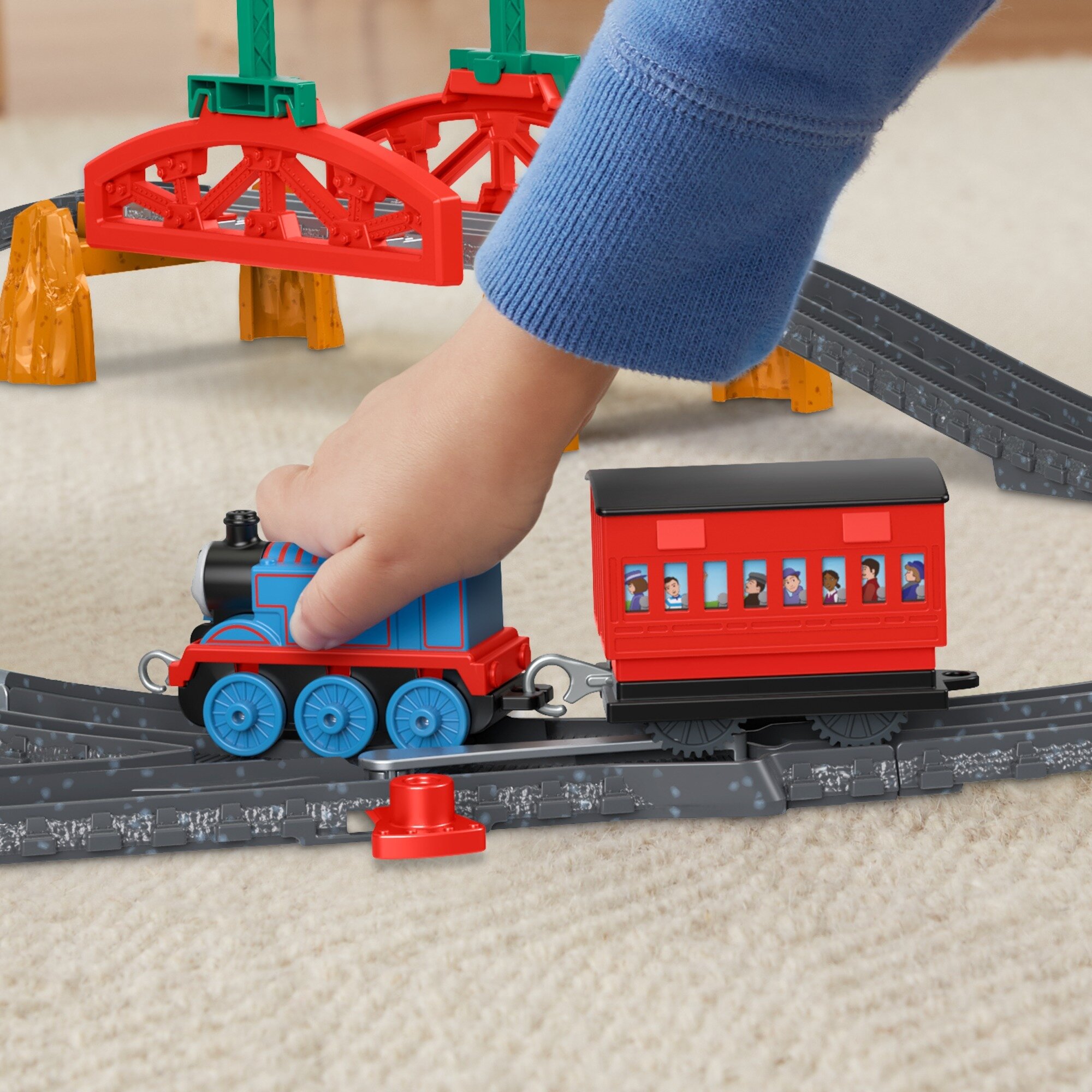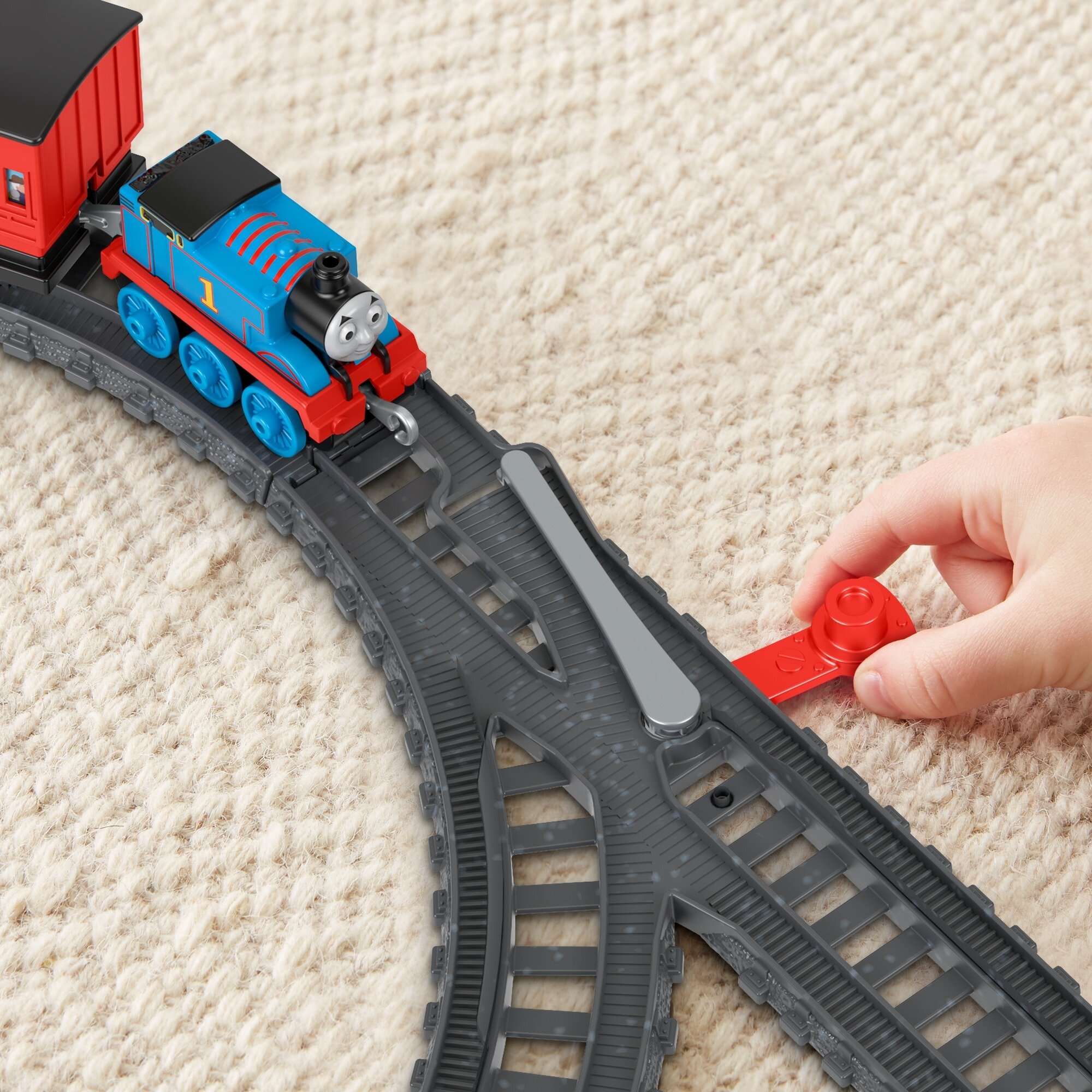 Üst kısımdaki taşıma kolu sayesinde çocuklar, en sevdikleri lokomotifi raylarıyla birlikte her yere taşıyabilir.