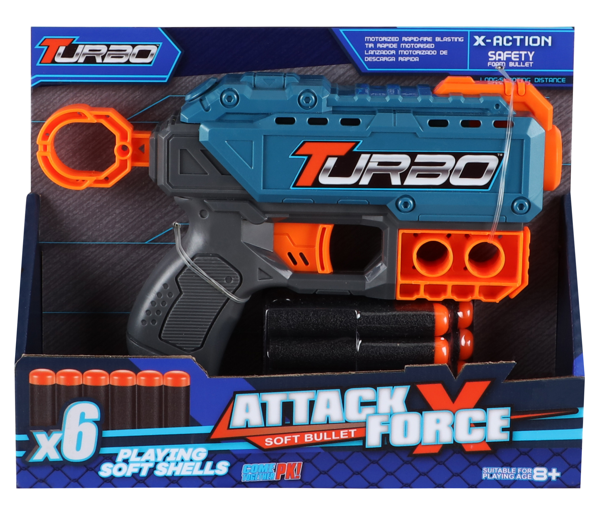 Turbo Attack X Force Dart Atan Mini Tabanca, kompakt ve güçlü tasarımıyla hem iç mekân hem de dış mekân oyunları için mükemmel bir oyuncak blaster’dır.