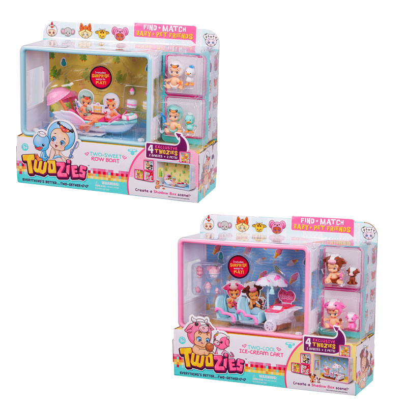 Dondurma temalı oyun setinde ise 2 adet Twozies İkizi (4 figür), dondurmalarla dolu şemsiyeli bir dondurma servis arabasıyla birlikte geliyor.