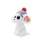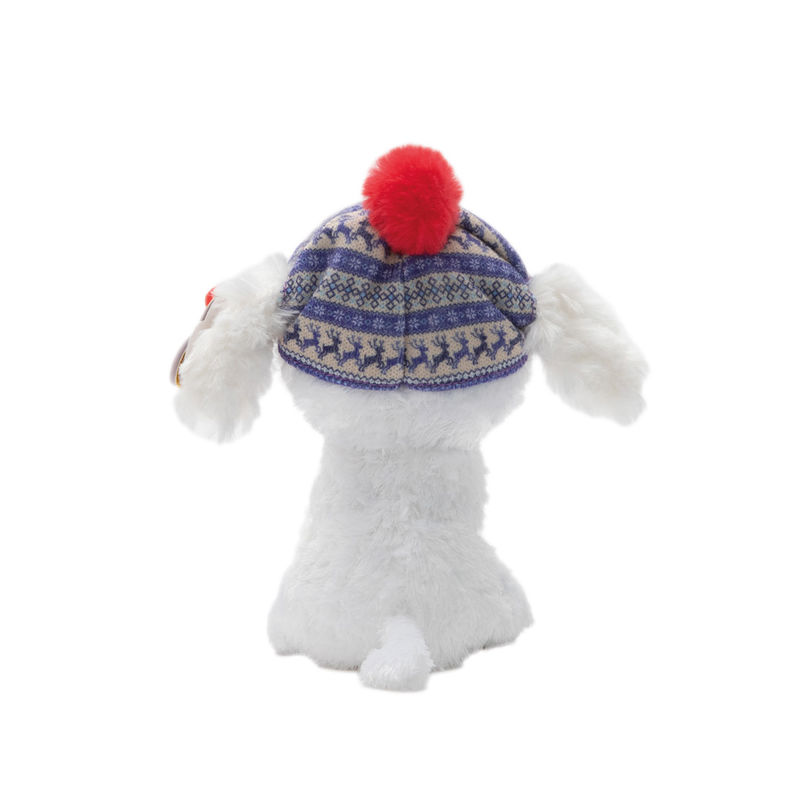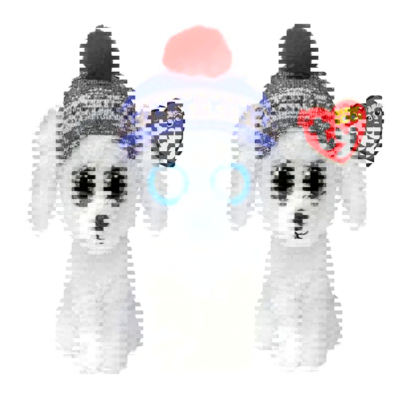Beanie Boo parlak mavi parıltılı gözlerle çok güzel mavi ve kırmızı kış şapkası ile çok sevimlidir.