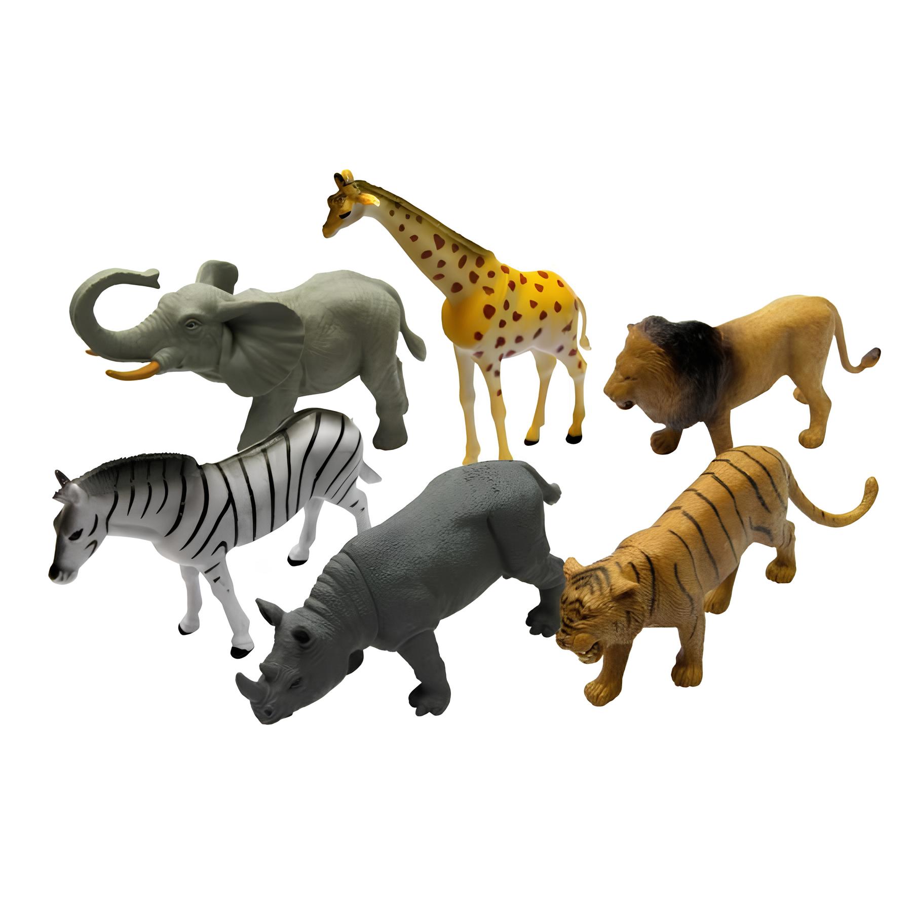 Fil, zürafa, aslan, gergedan, zebra, kaplan 6’sı bir arada hayvanlar.