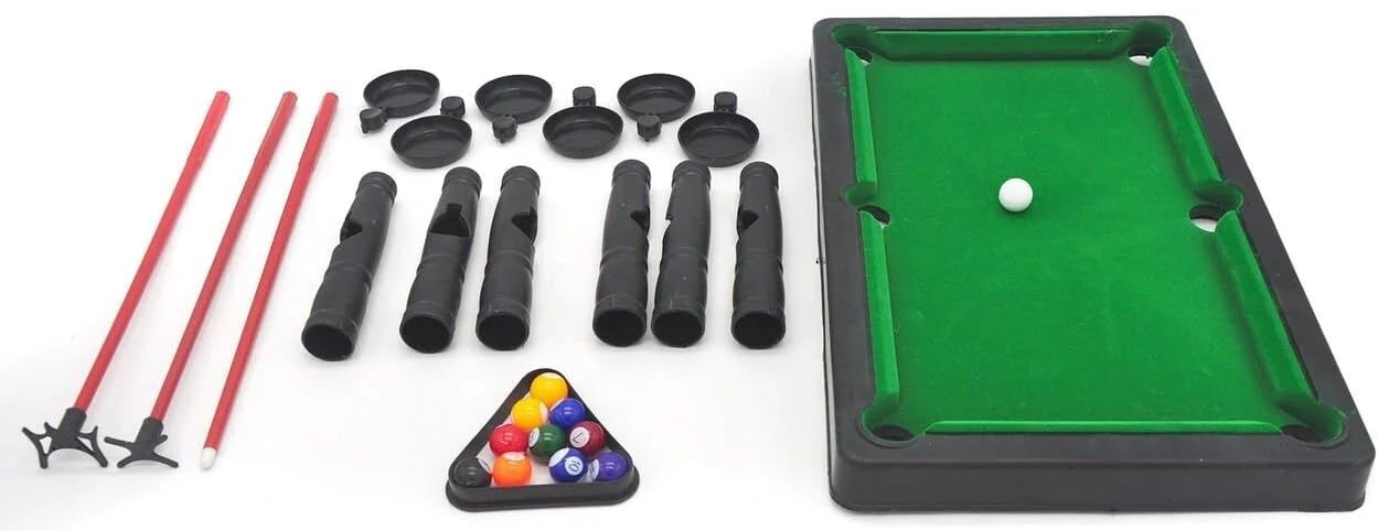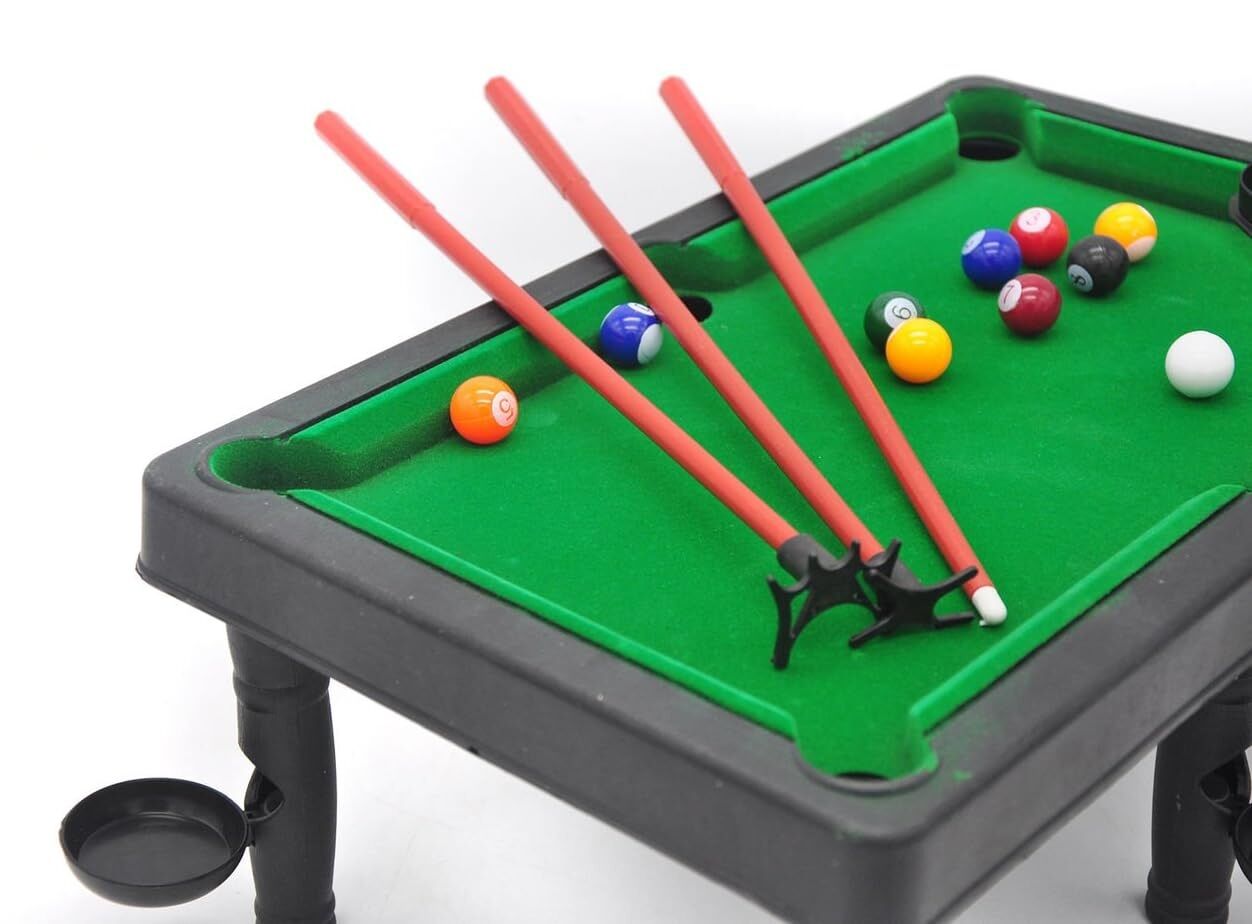 Bu set çocuklar için Bilardo oyunu, isteka çubukları, bilardo masası, üçgen çerçeve ve renkli, numaralandırılmış toplarla tam boyutlu modelleri simüle ederek eğlenceli bir havuz oyunu yaratan sekiz toplu bir bilardo oyunudur!