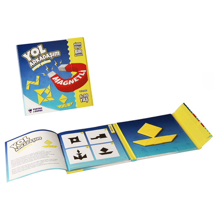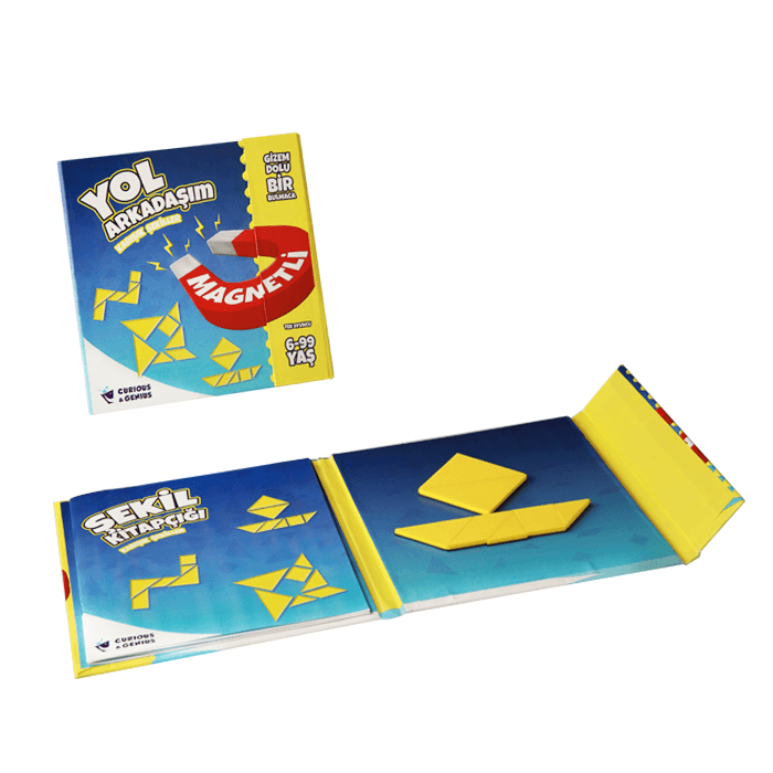 Magnetli tangram parçaları ile ister kitapçıktaki 60 farklı bulmacayı çözün, isterseniz hayalinizdeki şekilleri yapmaya çalışın.