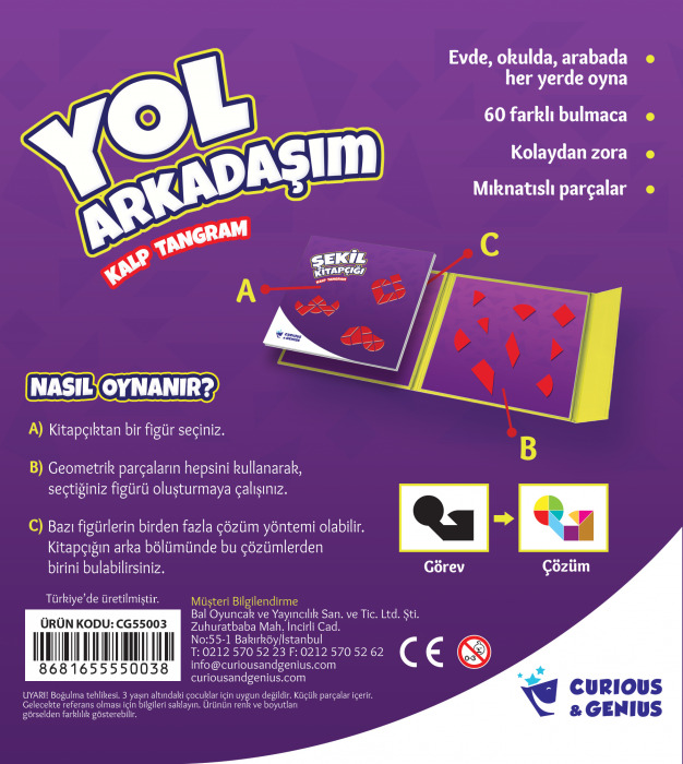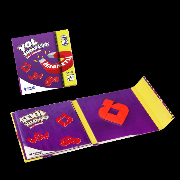 Magnetli tangram parçaları ile ister kitapçıktaki 60 farklı bulmacayı çözün, isterseniz hayalinizdeki şekilleri yapmaya çalışın.