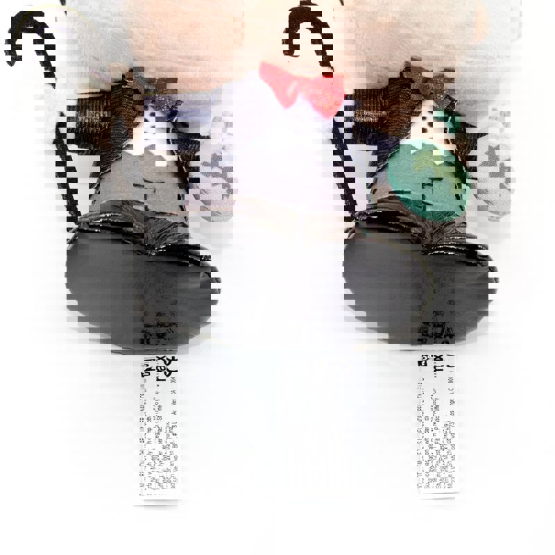 Gömlek ve pantolon çizilmiş, kırmızı kravat malzemesi, parlak siyah sentetik ayakkabıları vardır.
